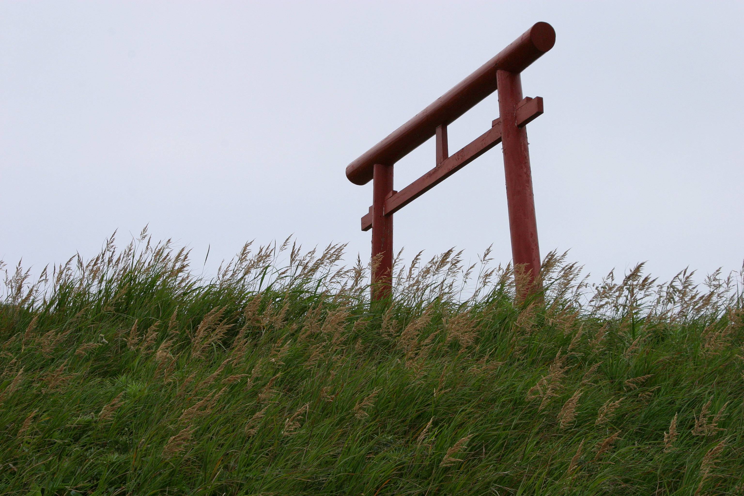 ススキ野原にぽつんと神社の鳥居が立っていました。