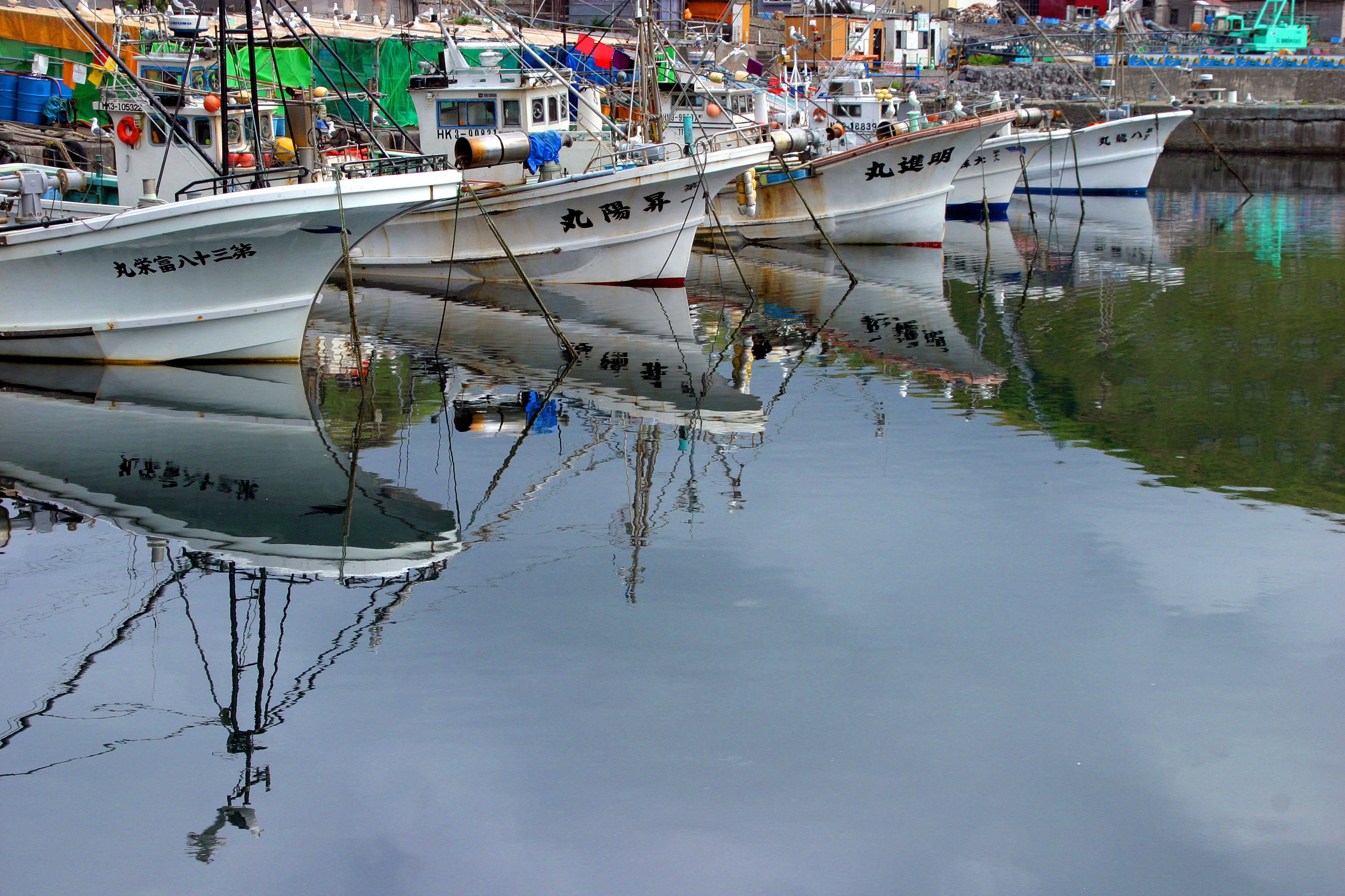 小さな漁港に停泊する船たち。