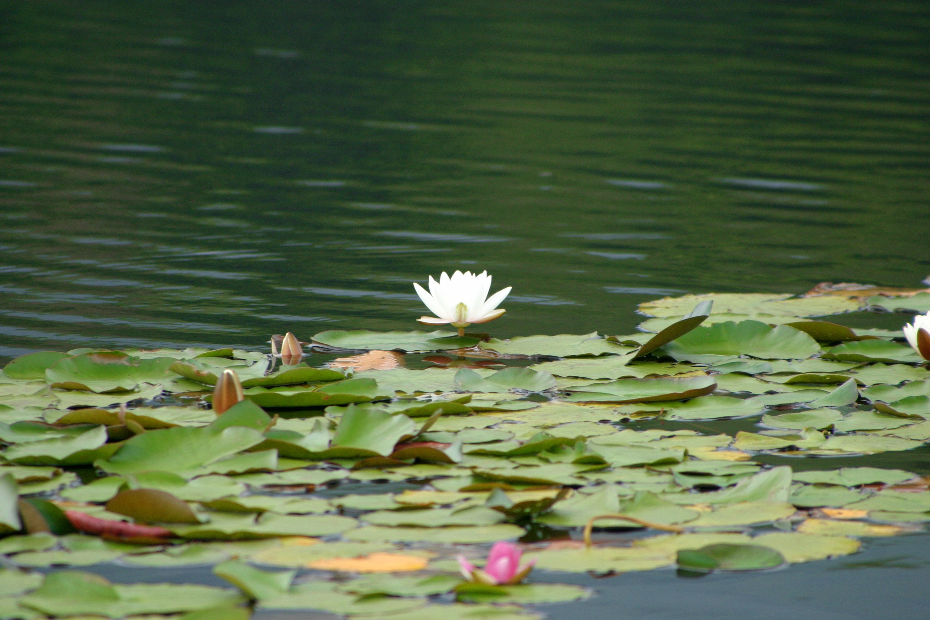 水面には白い花がひとつだけ咲いています。この沼のヒロインですね。
