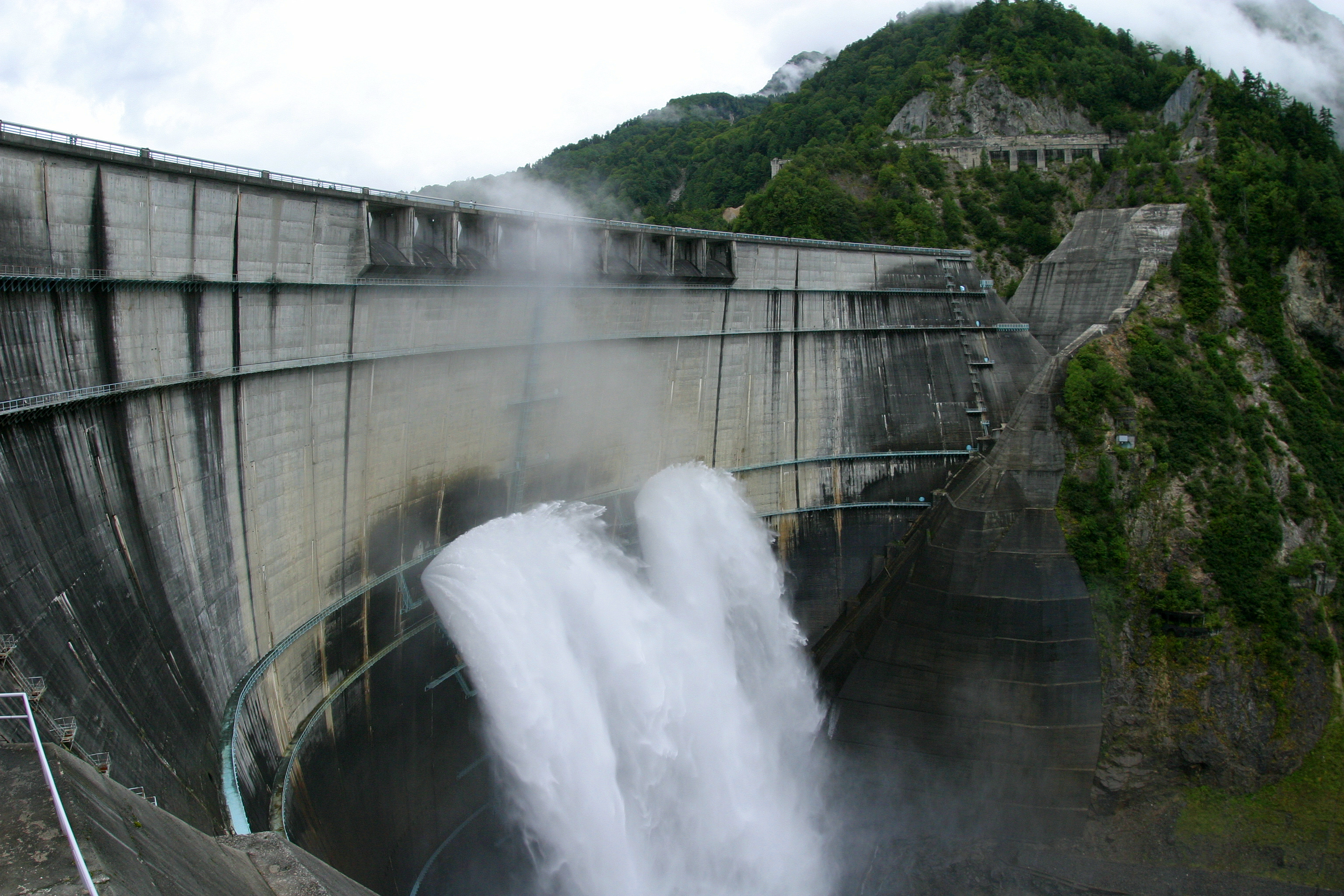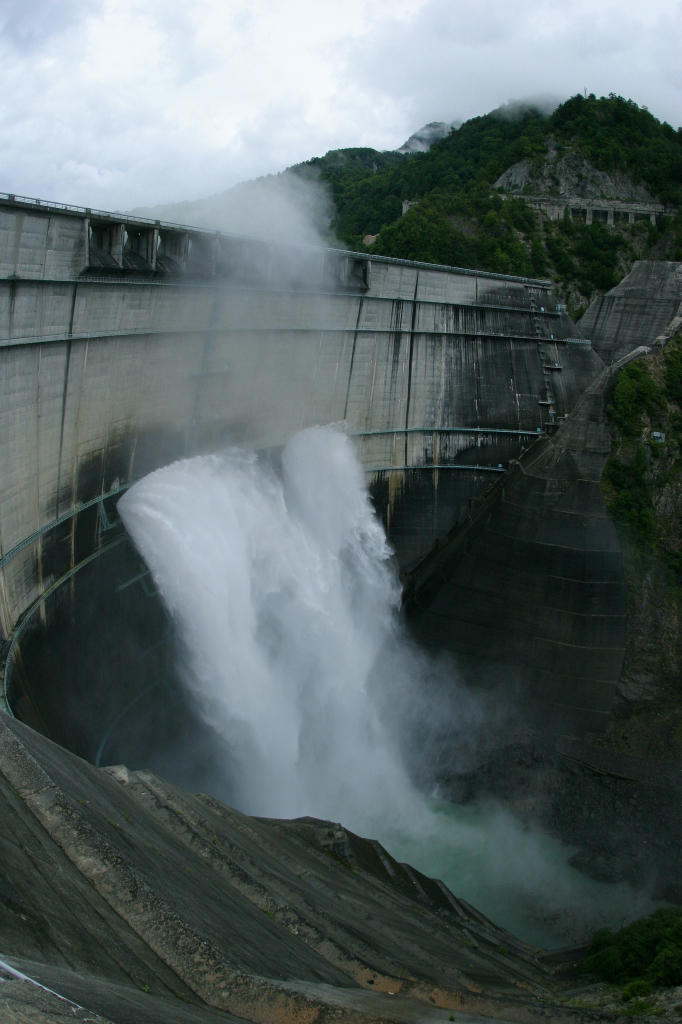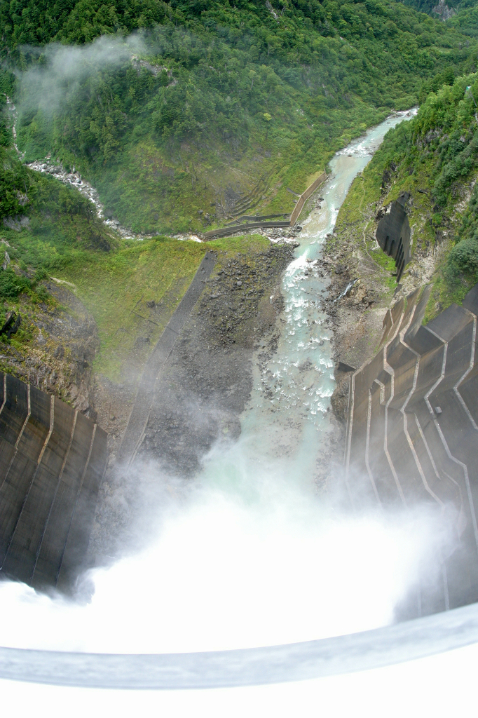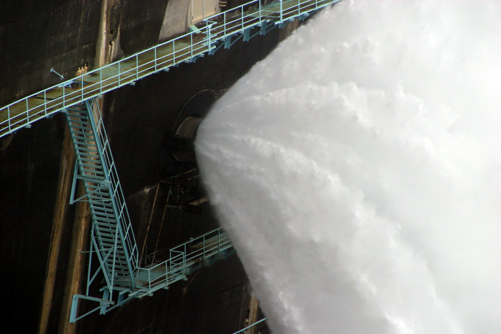 ダムから放たれた水が川を下っていきます。
