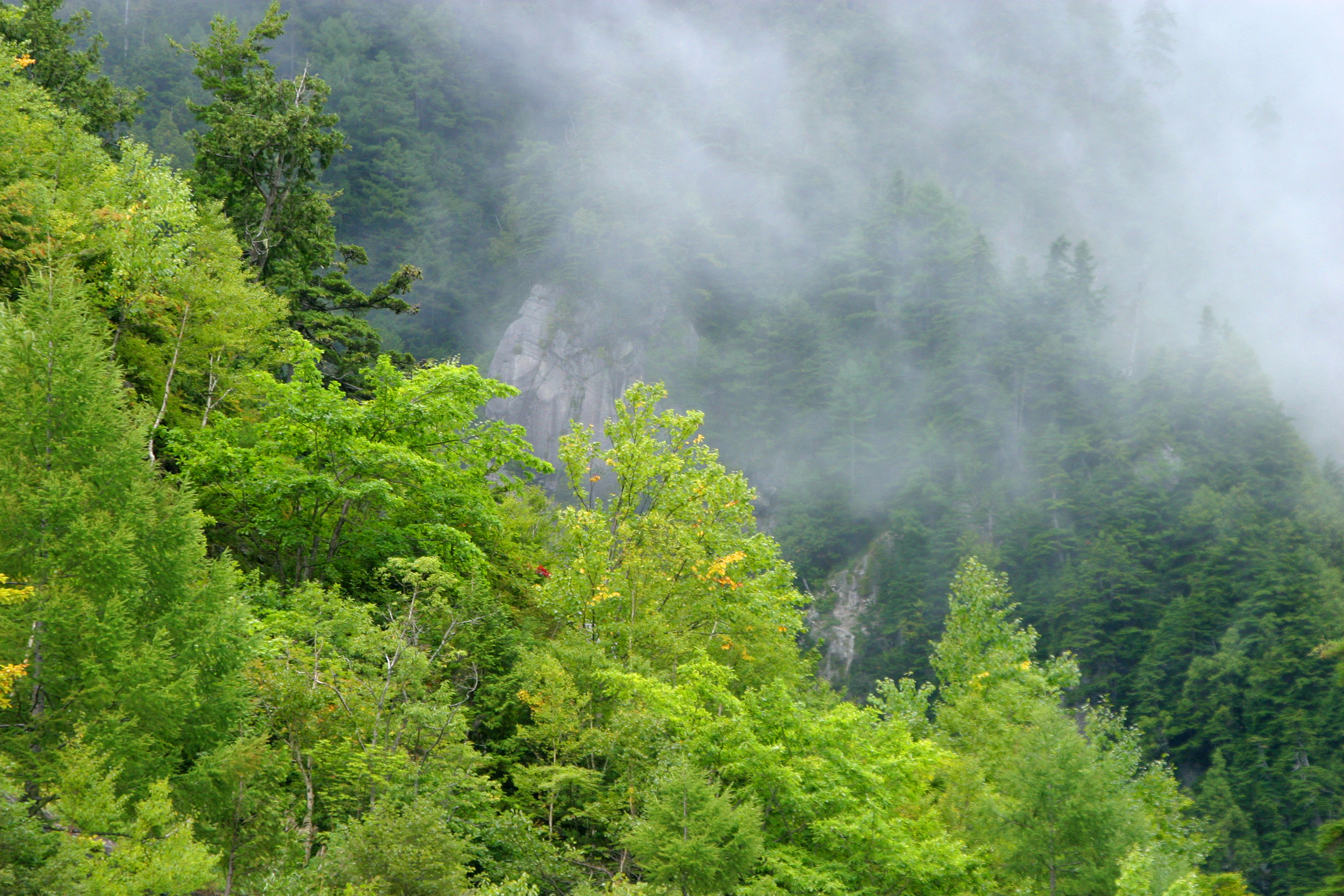山霧が谷からはい上がって木々に絡みつきます。