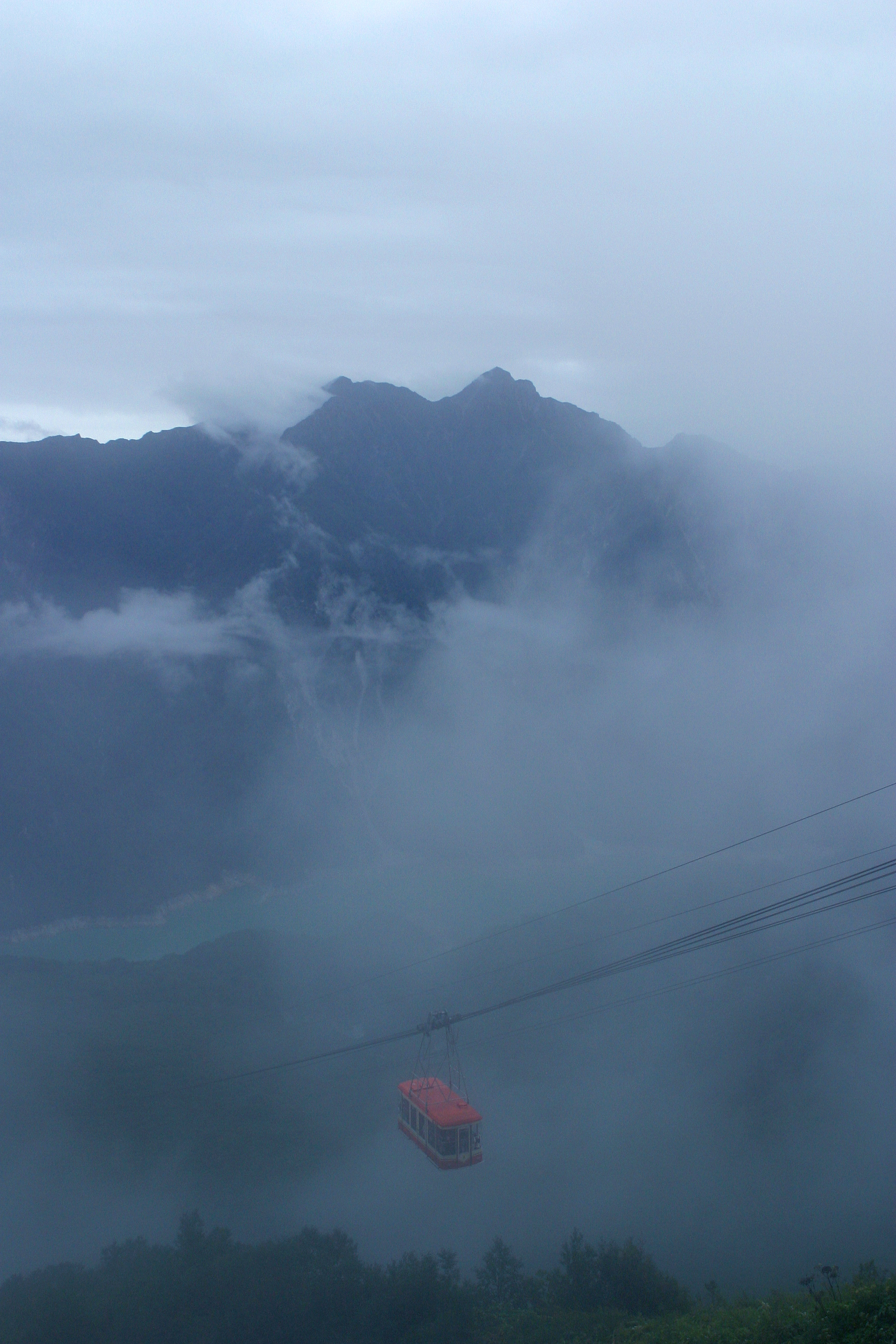 ロープウェイが濃霧の中から姿を現します。