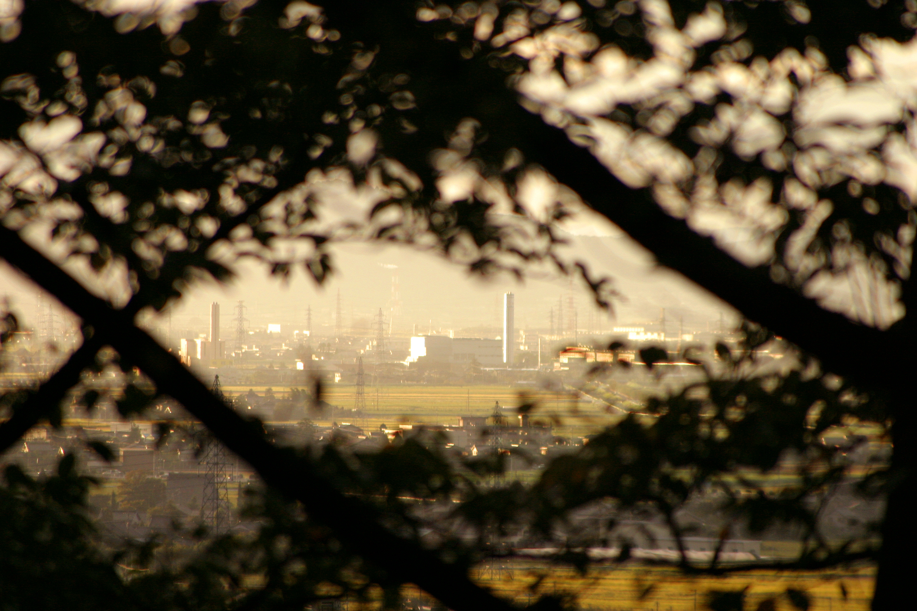 格子模様になった木の間から覗く富山市郊外。幻想的な風景です。