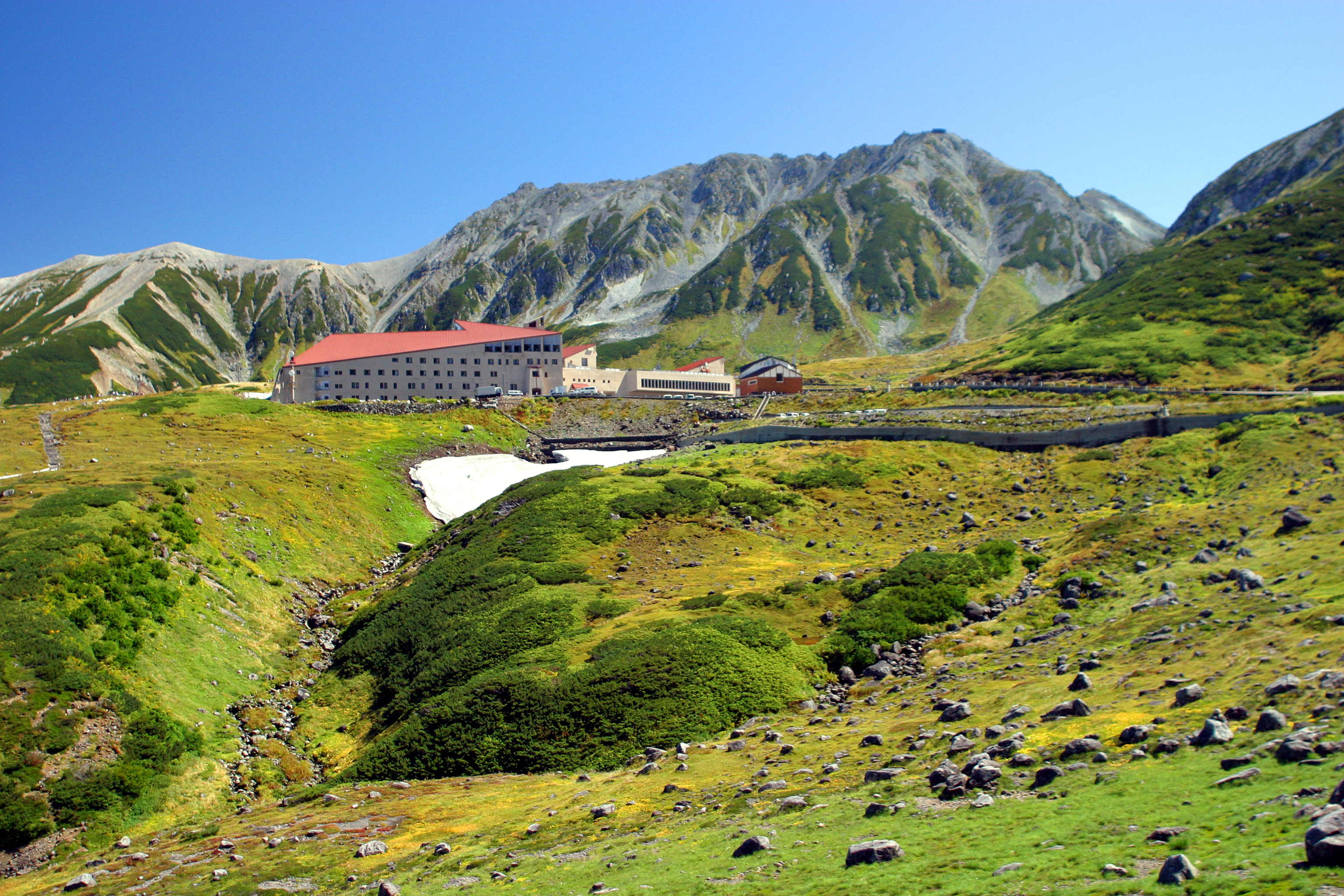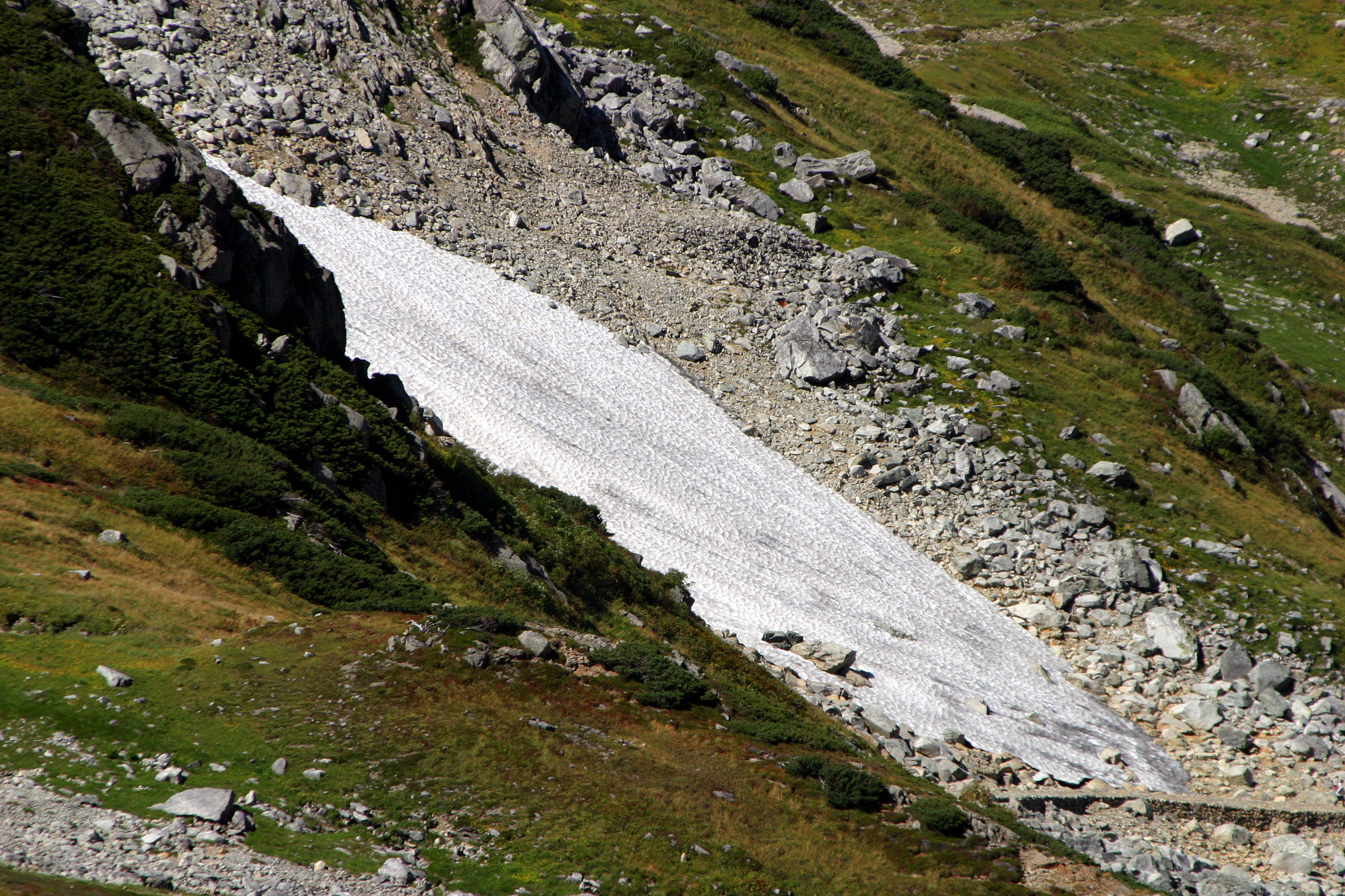 真夏ですが、山の斜面には雪がそのまま残っています。