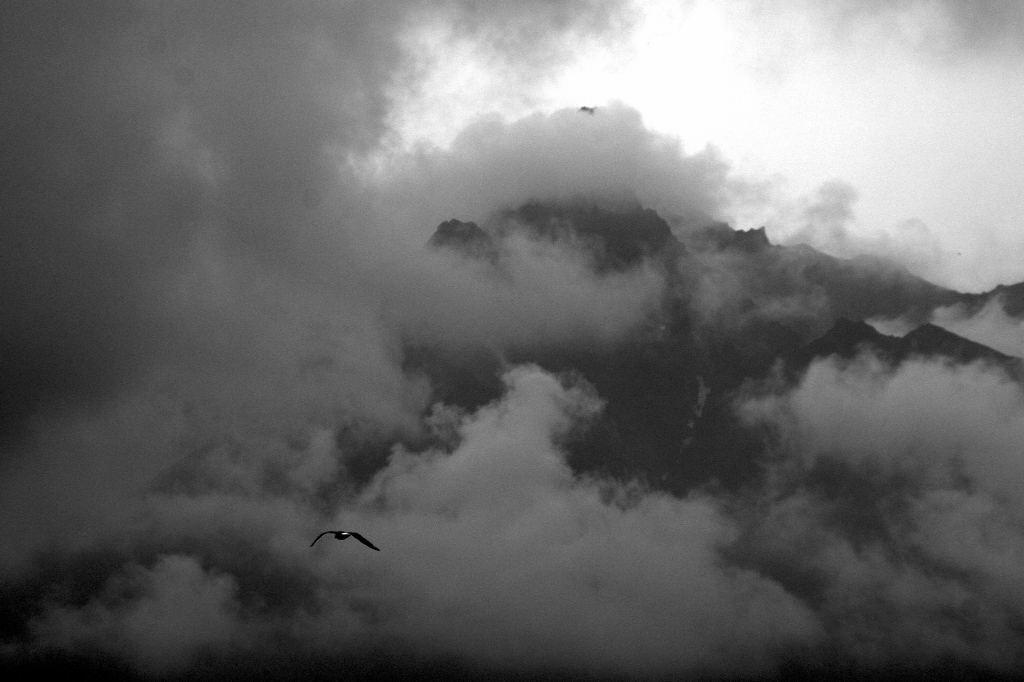 利尻富士に向かって飛んでいく鳥。雲が湧いて実に味のある光景です。