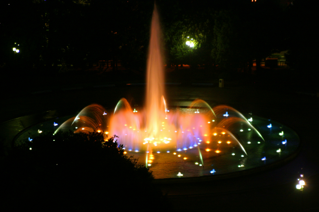 夜の公園の噴水です。ライトアップされています。