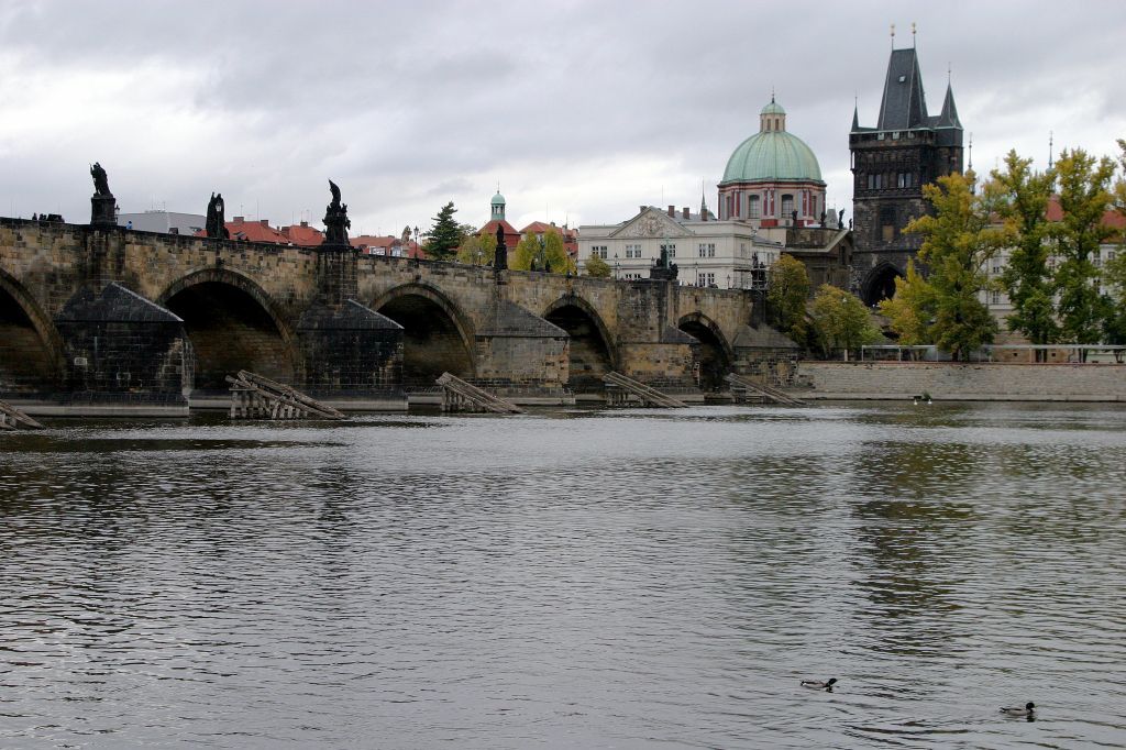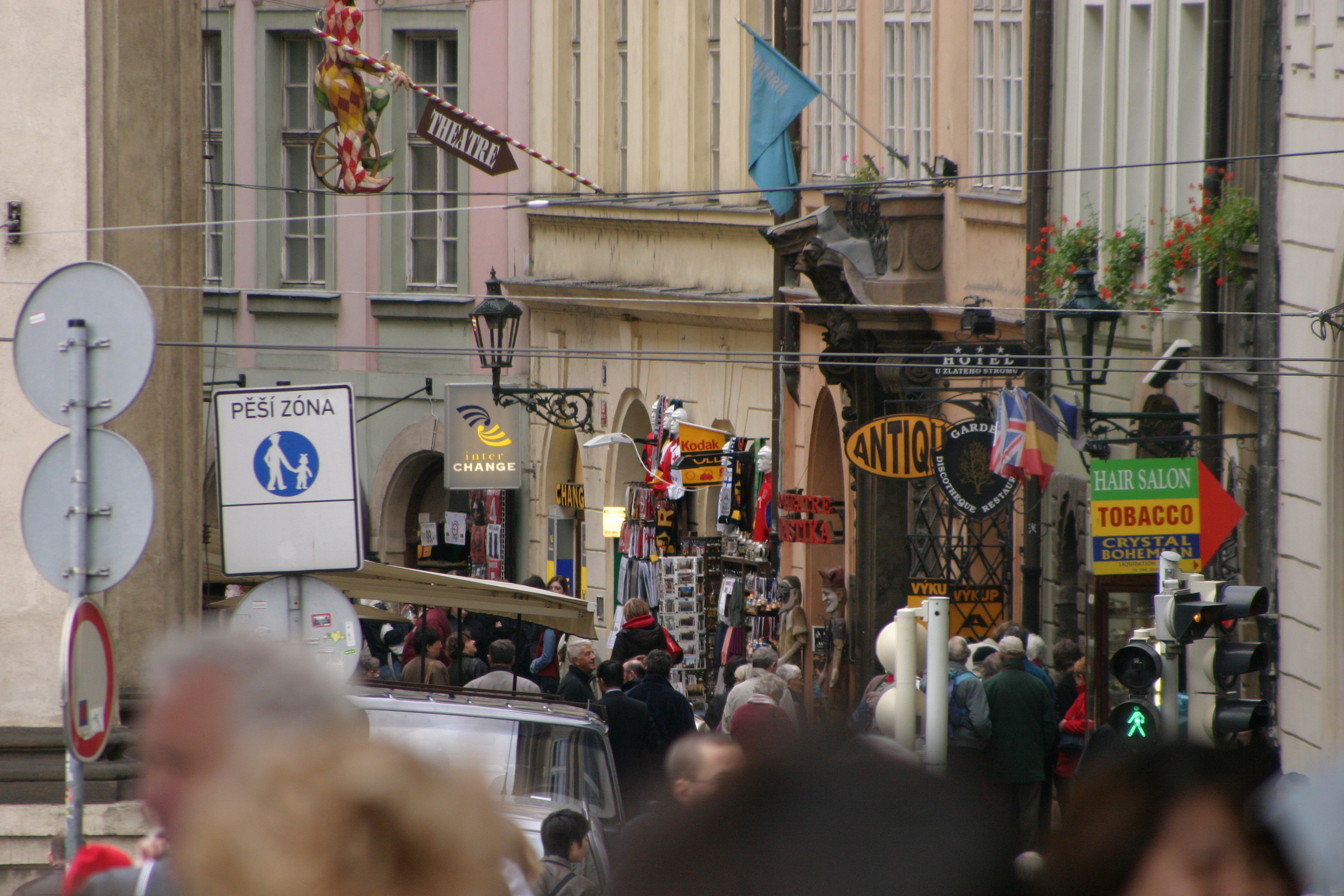 カレル橋から、繁華街の方向を見ました。観光客でごったがえしています。