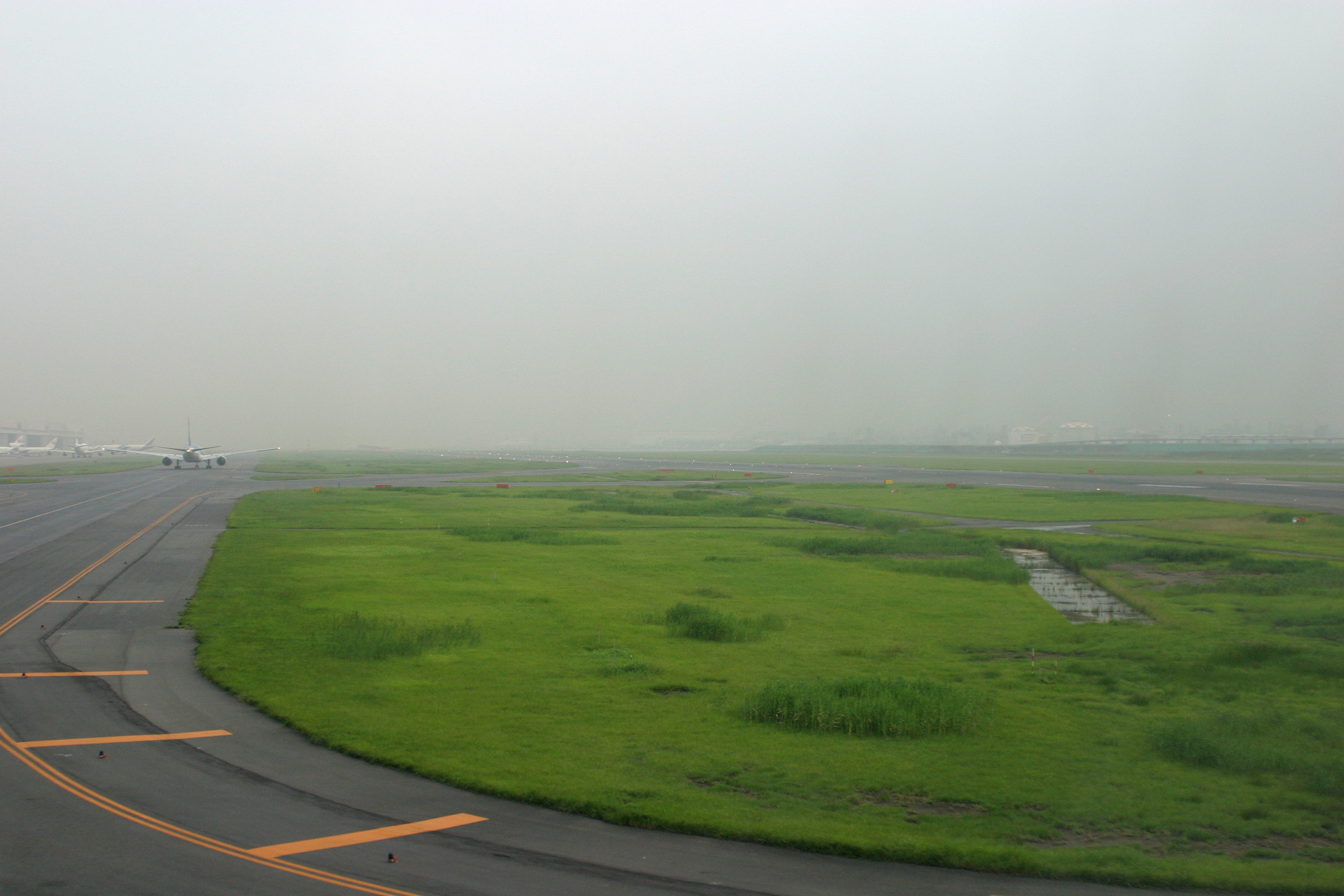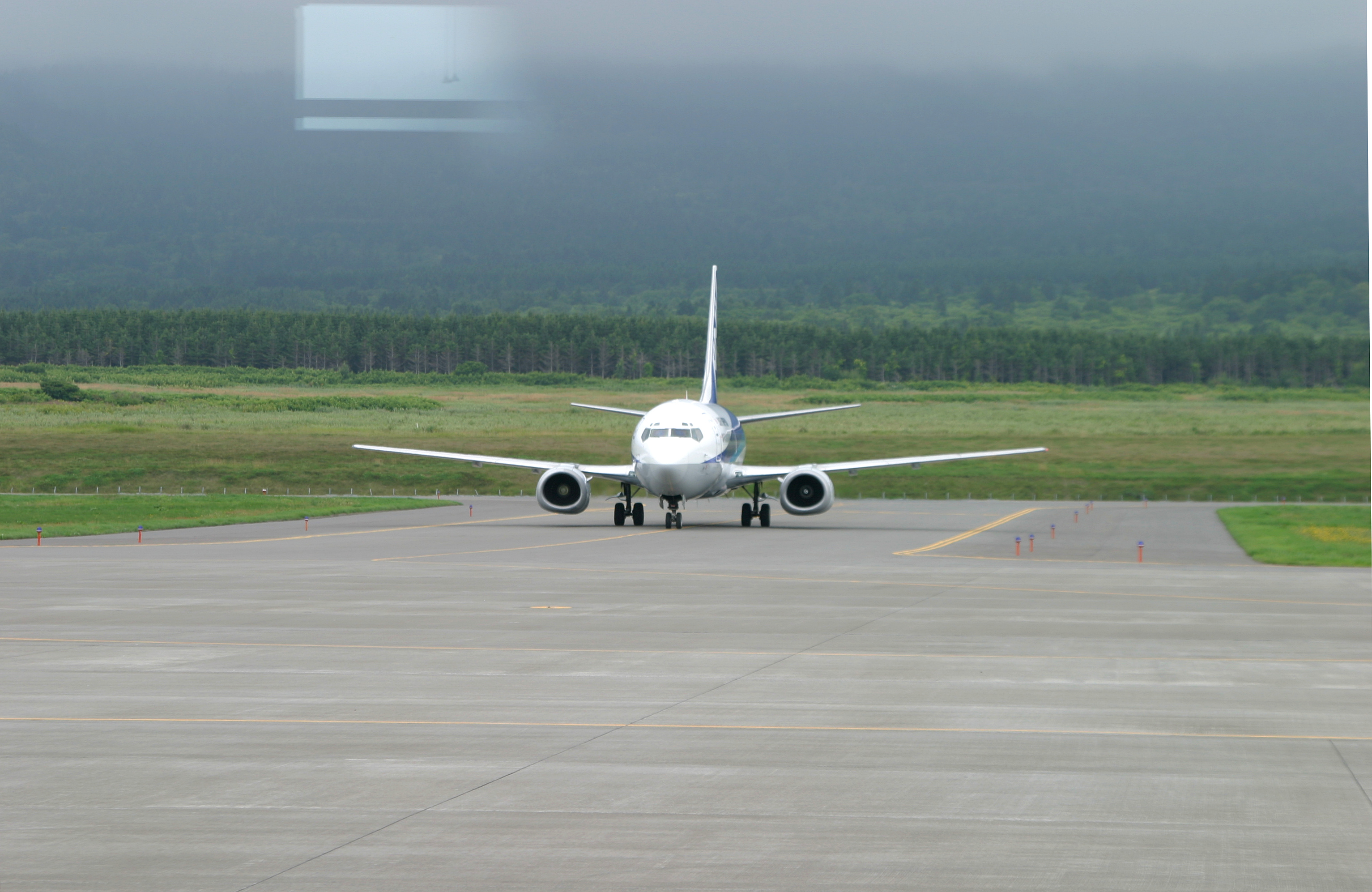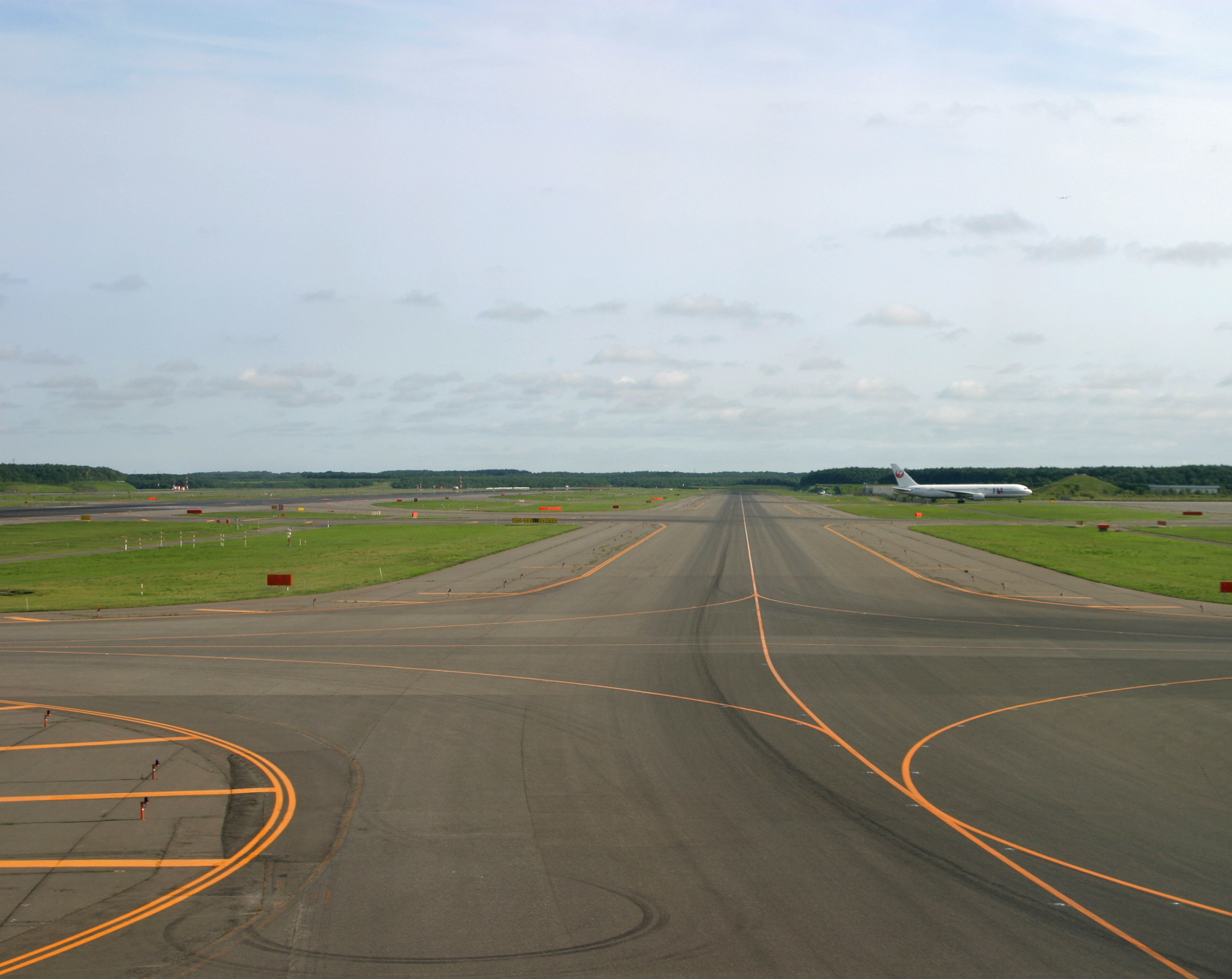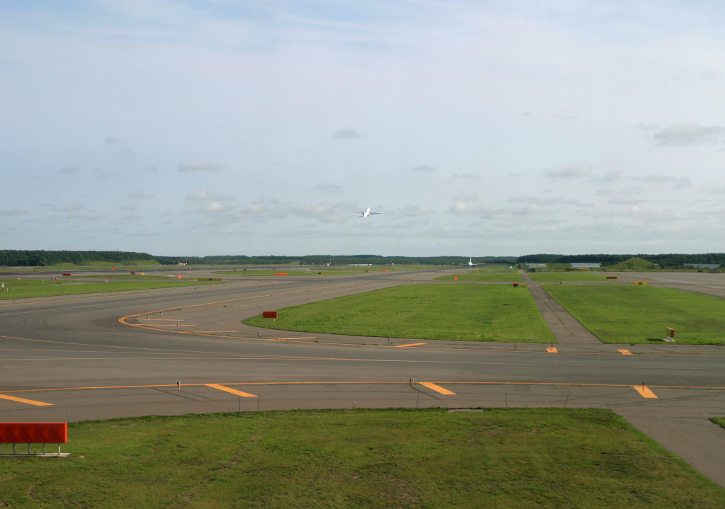 新千歳空港の滑走路です。ちょうど飛行機が降りてくるところですね。