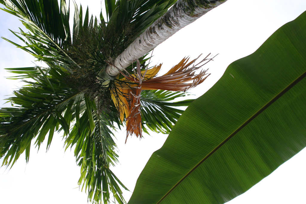 椰子の葉の大きな陰が巨大なおばけのようです。