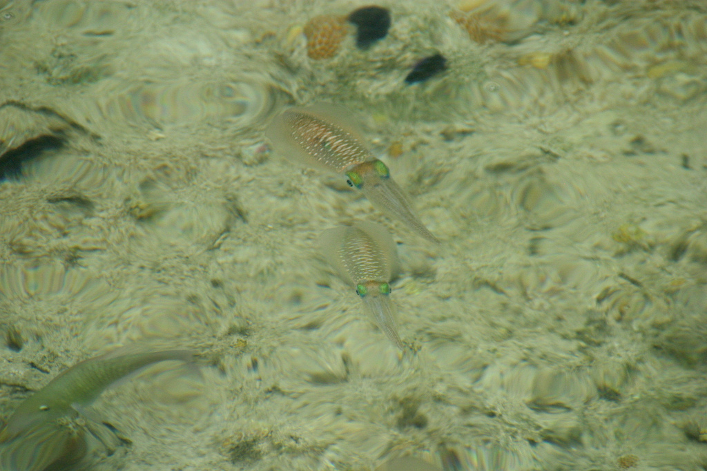 桟橋から海を見たら、透き通ったイカが泳いでいました。