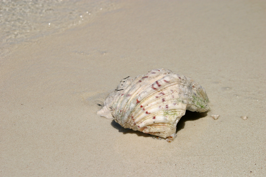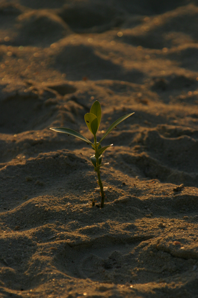 椰子の実でしょうか。浜辺に芽を出しています。これから椰子の木になるのかな。