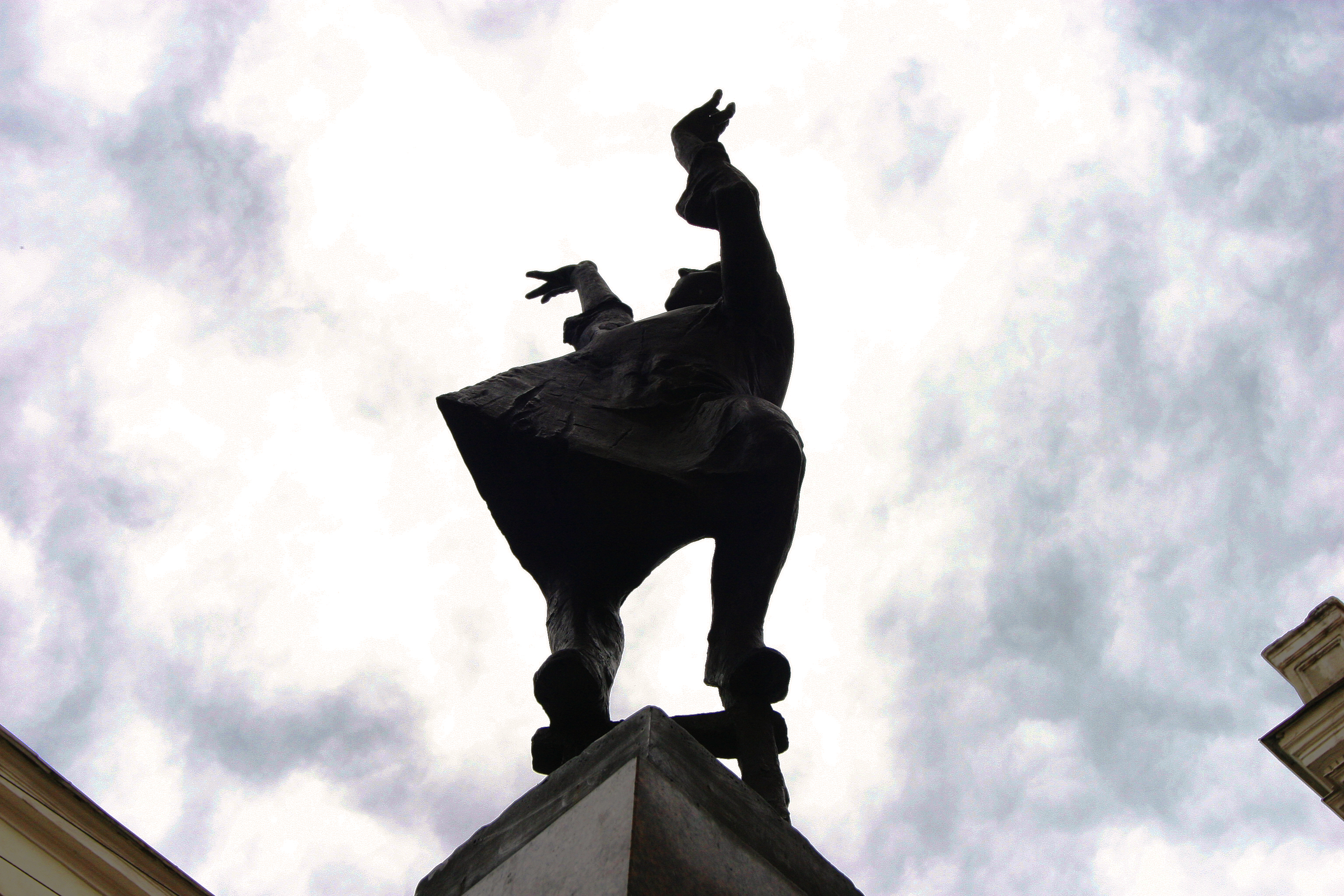旧市街にあった銅像を下から見上げるアングルで捉えました。踊るような不思議なポーズが面白いですね。
