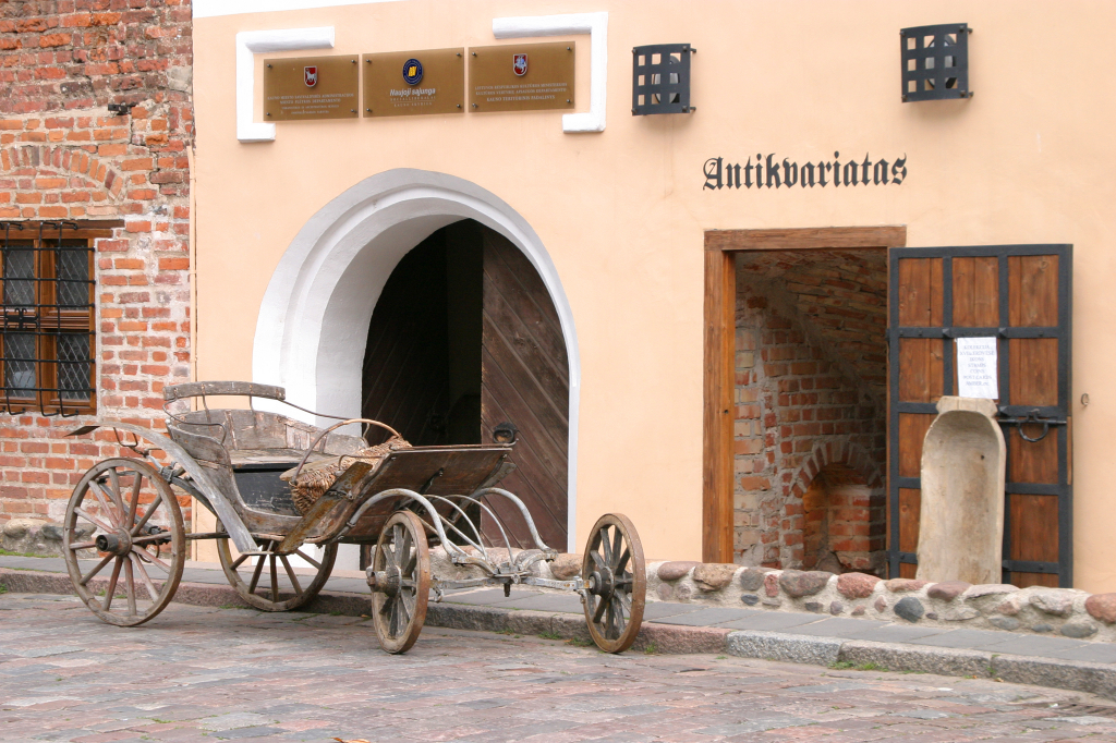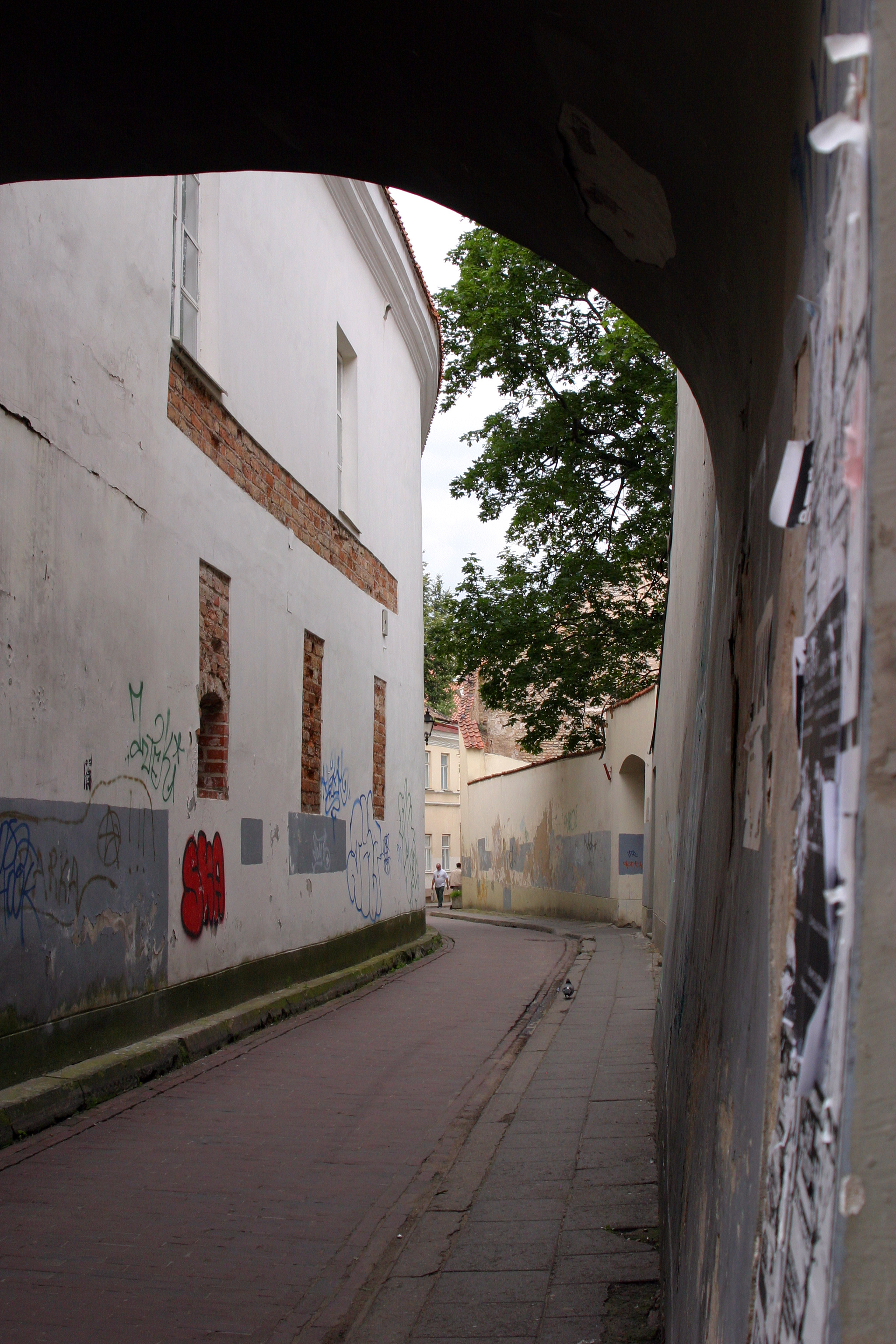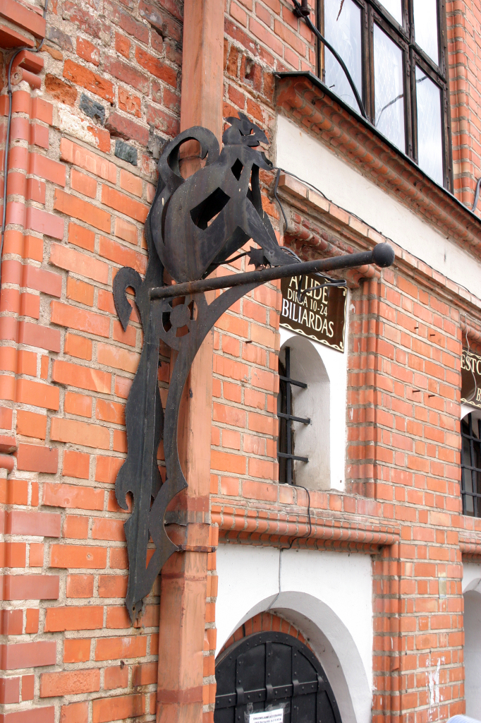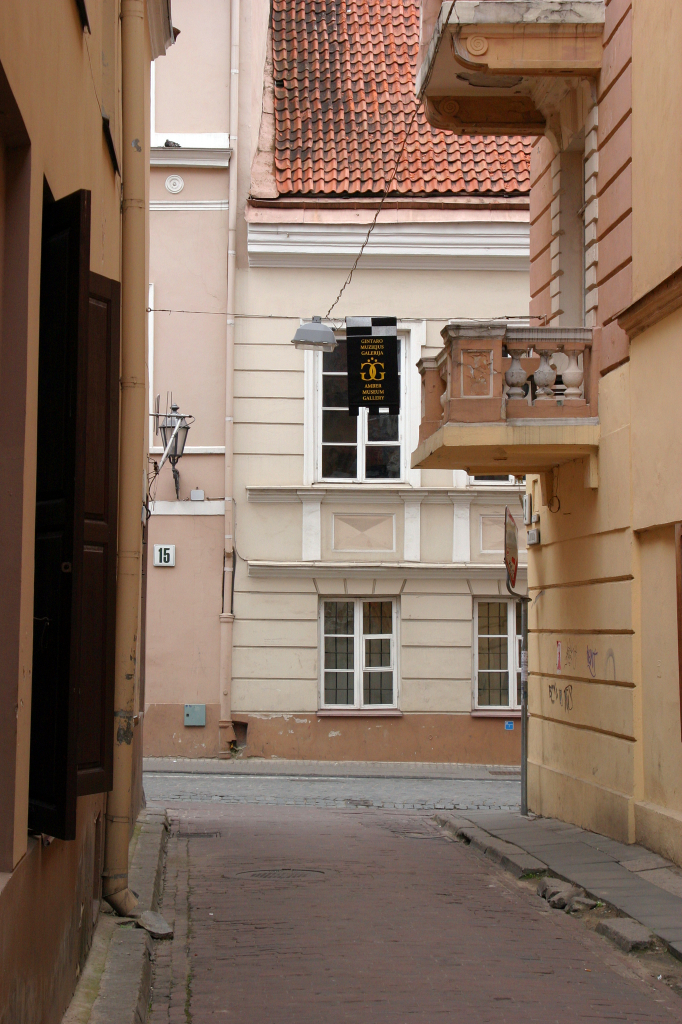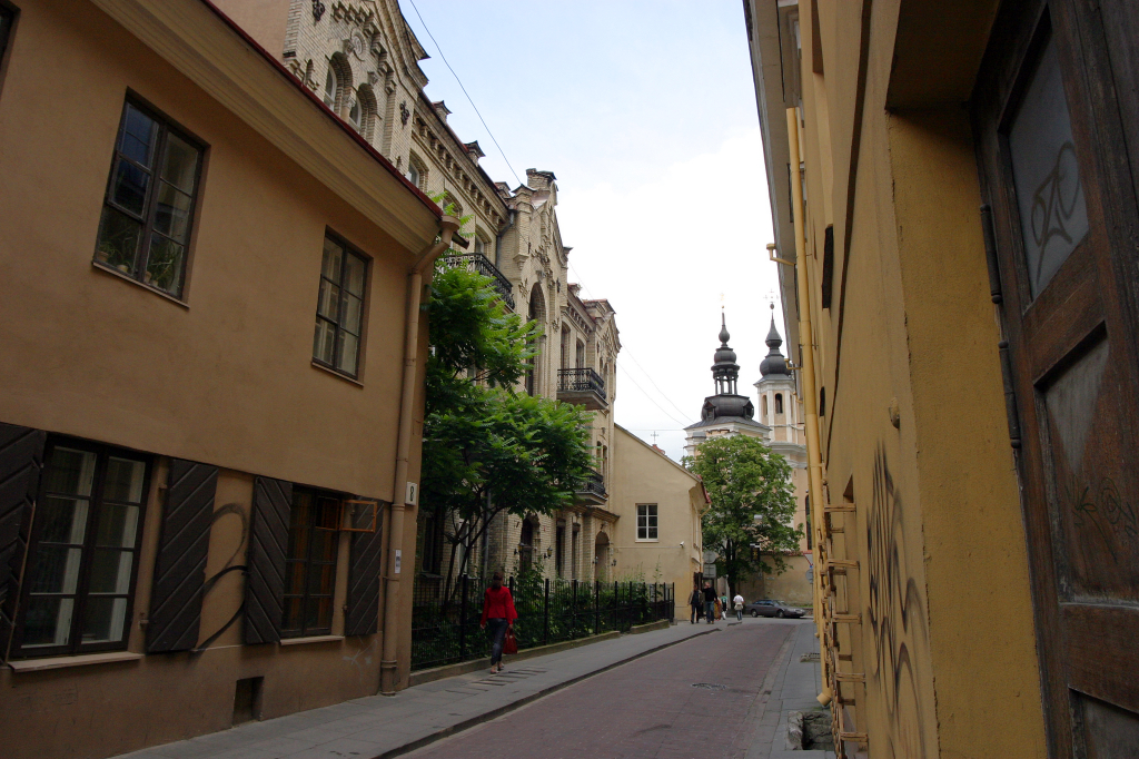 カウナス市内の路地です。右側の建物の飾りがとても変わっています。まるでピーマンのようです。