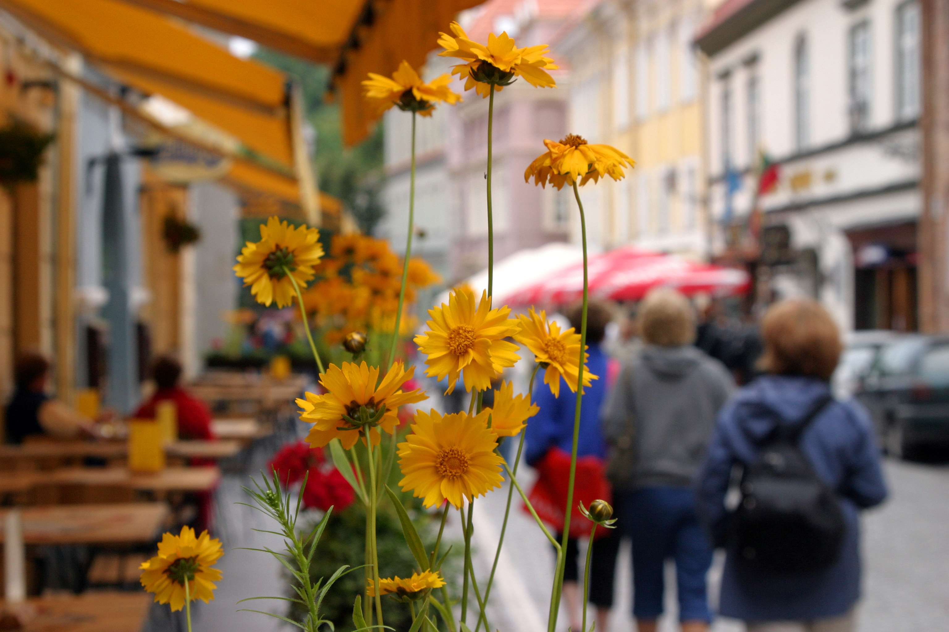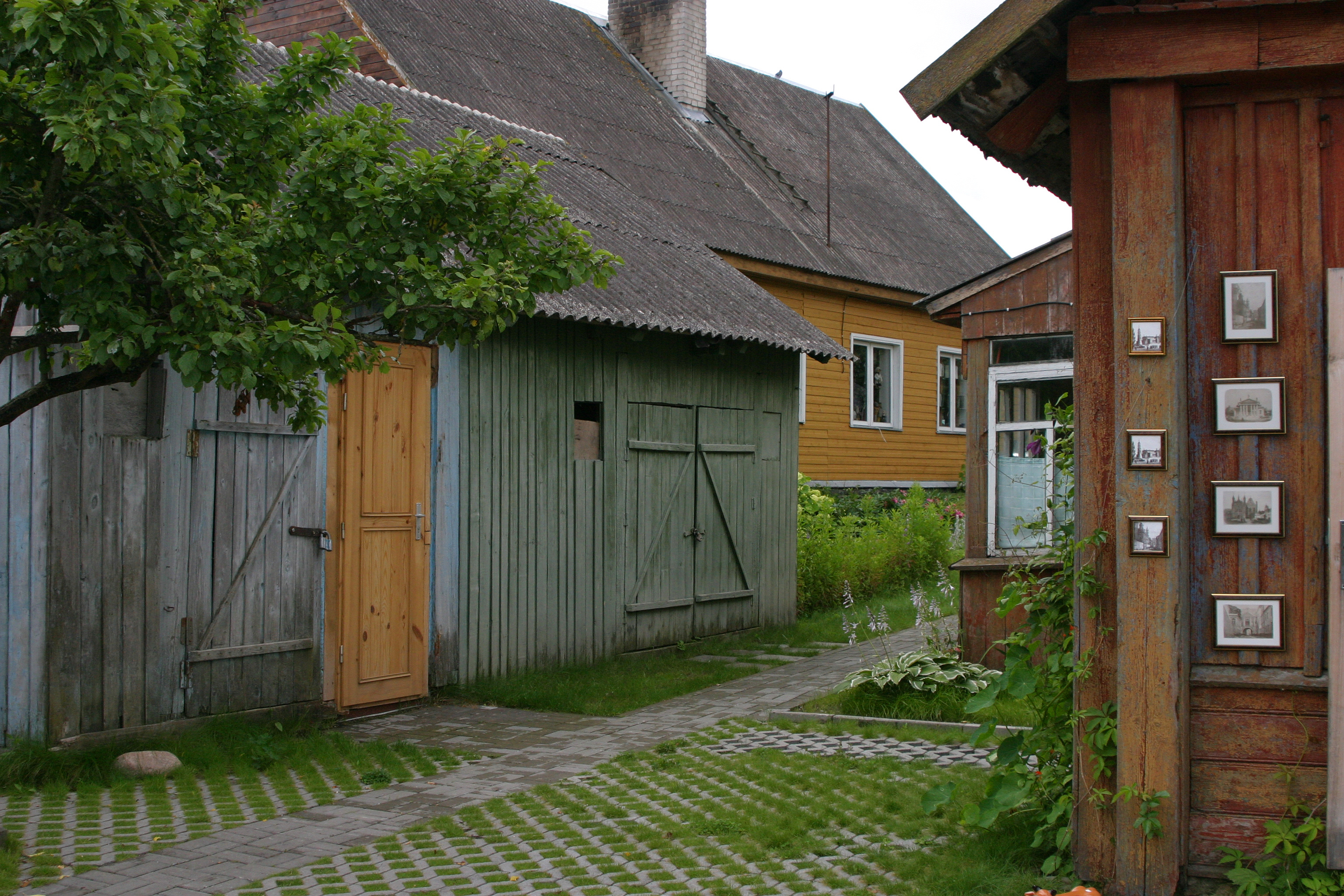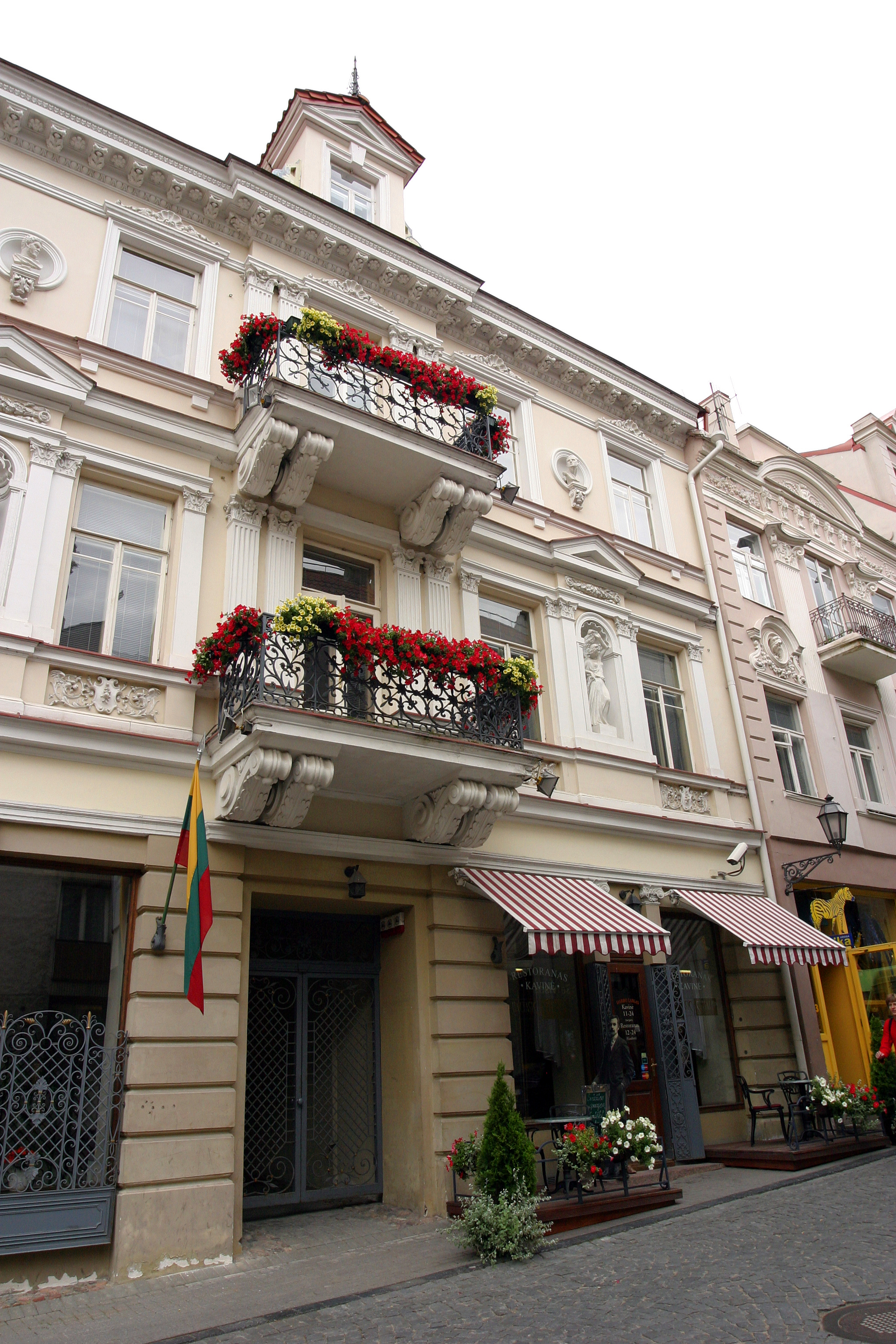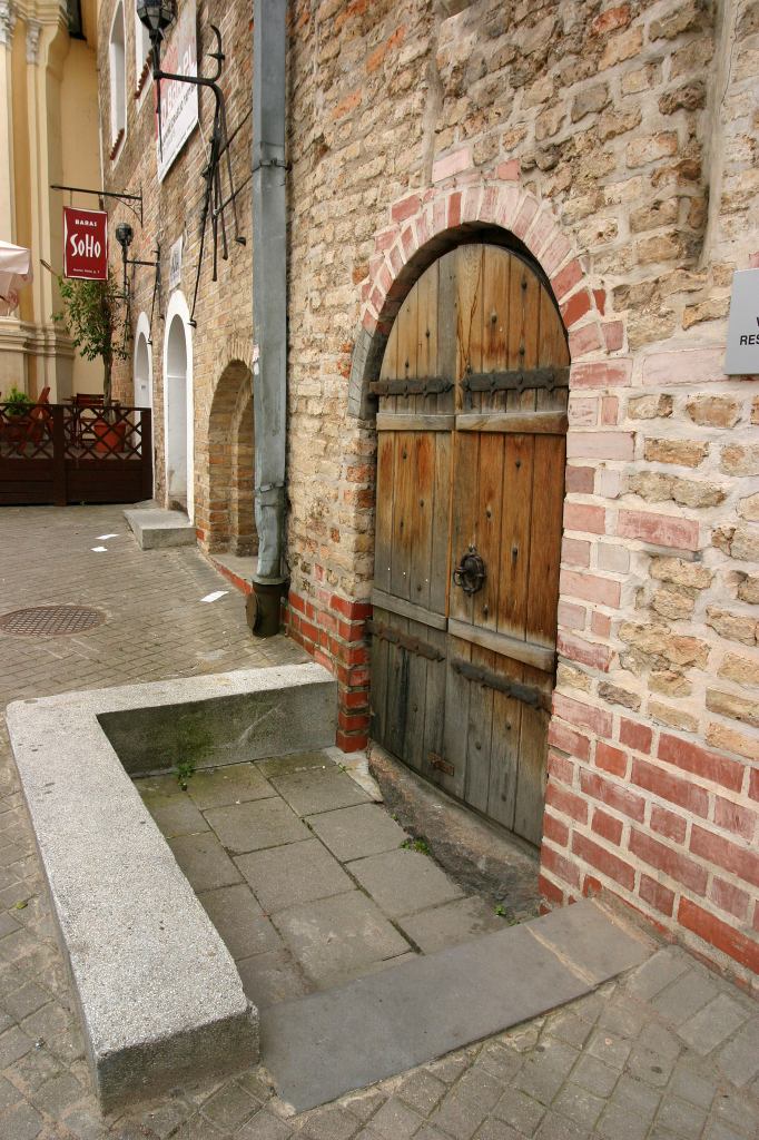 カウナス市内の路地です。右側の建物の飾りがとても変わっています。まるでピーマンのようです。