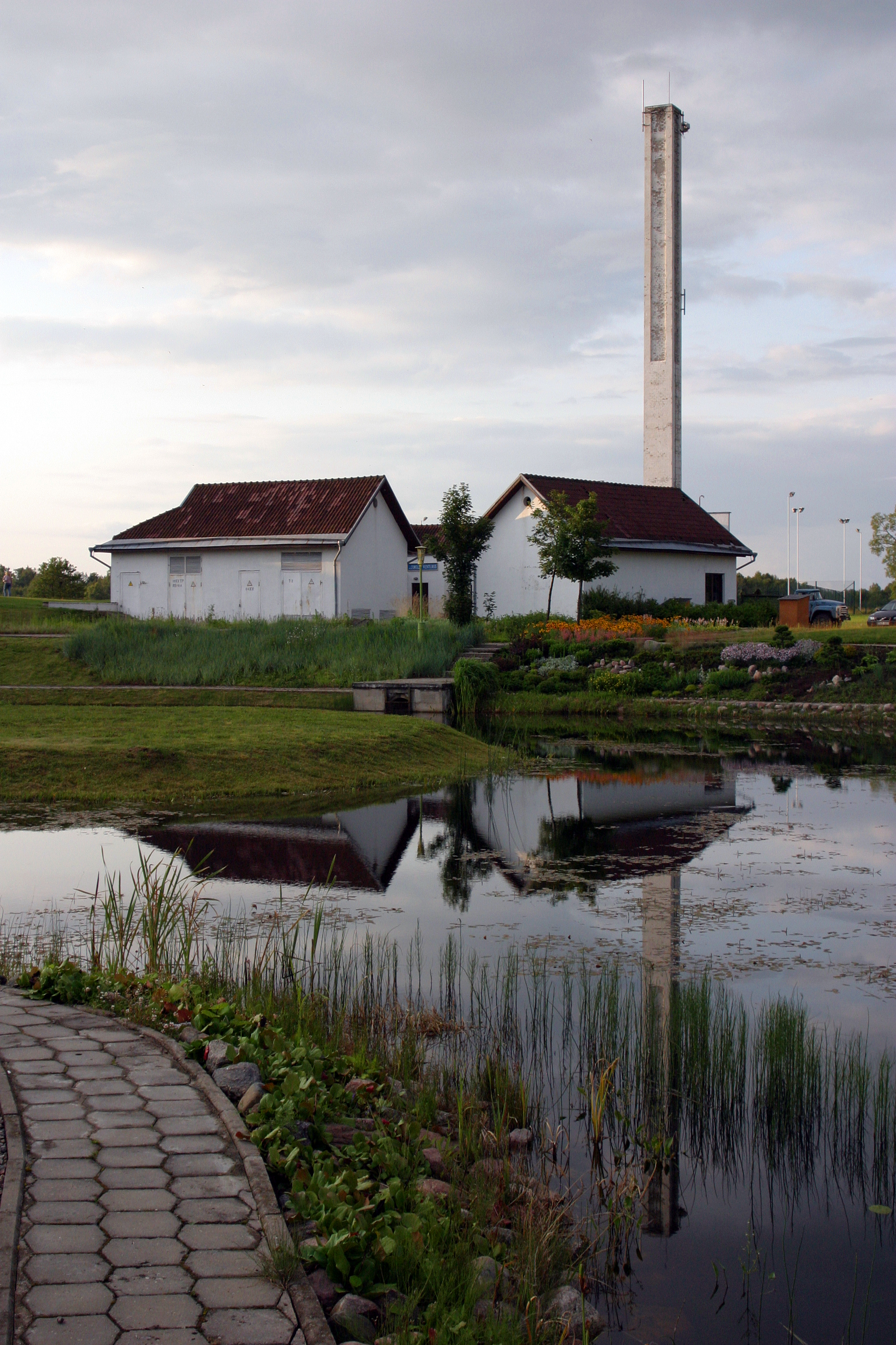 高い煙突がとても印象的。静まりかえった池に綺麗に写り込んでいます。