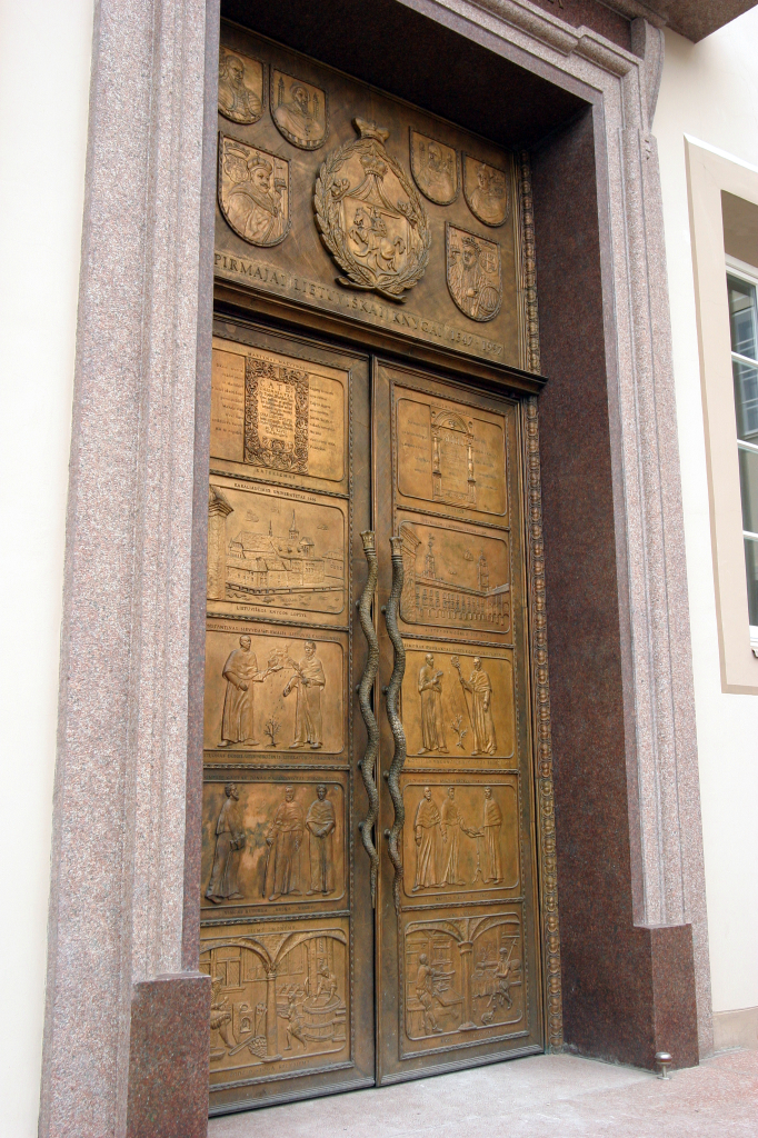 ビリニュス大学の建物の門。取っ手の部分は蛇(青大将)を象ったものだそうです。