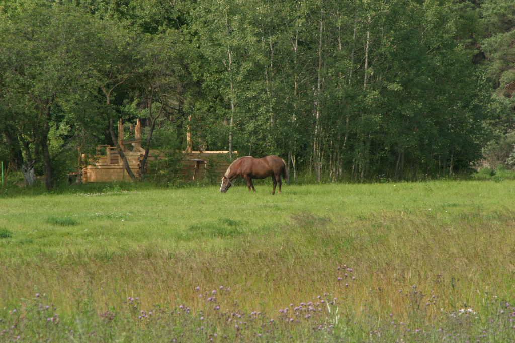 一頭だけ放牧された馬が、ゆったりと草をはんでいます。