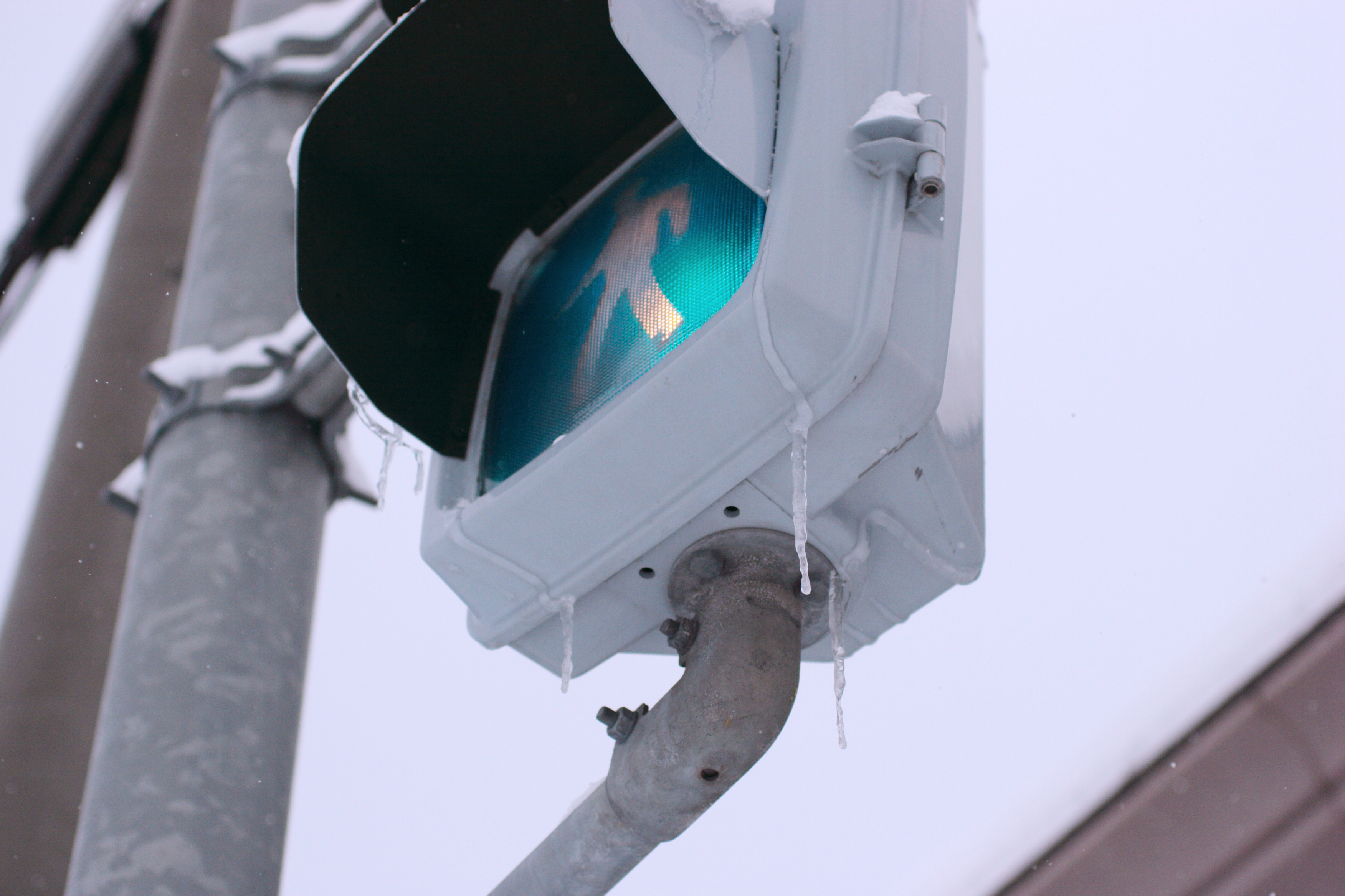 なぜかはわかりませんが、信号機からもつららが下がっています。下で待っているときに落ちてくるのではないかと、やや不安になります。
