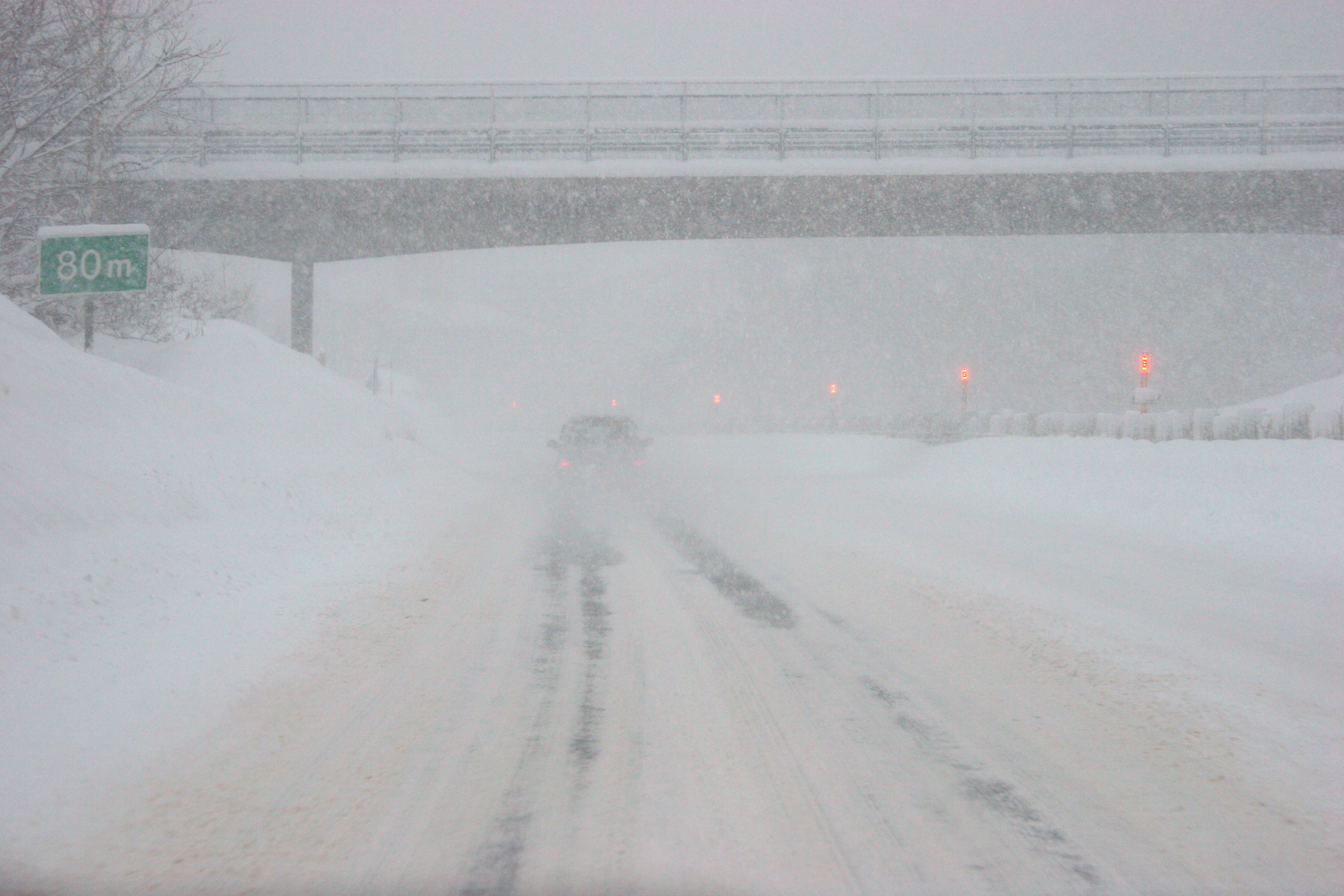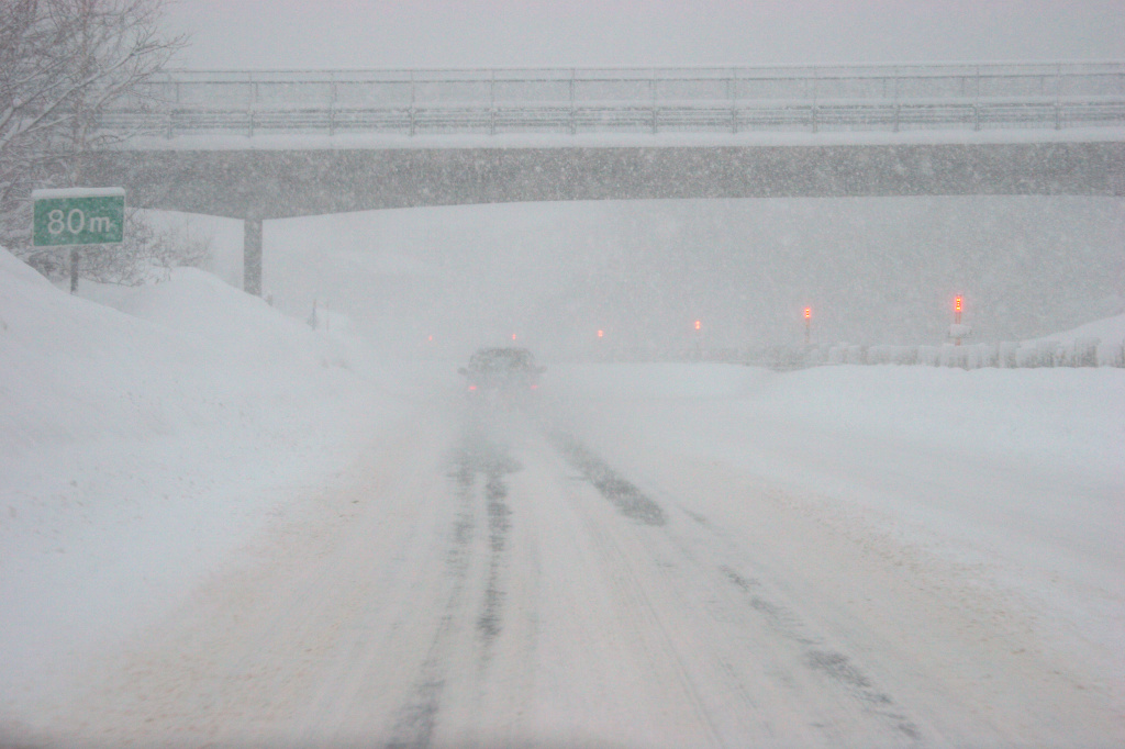 これは高速道路(札樽自動車道)の走行車線です。右側に追越車線がありますが、全く見えません。前の車もよく見えません。ちなみに、この直後に全面通行止めになりました。