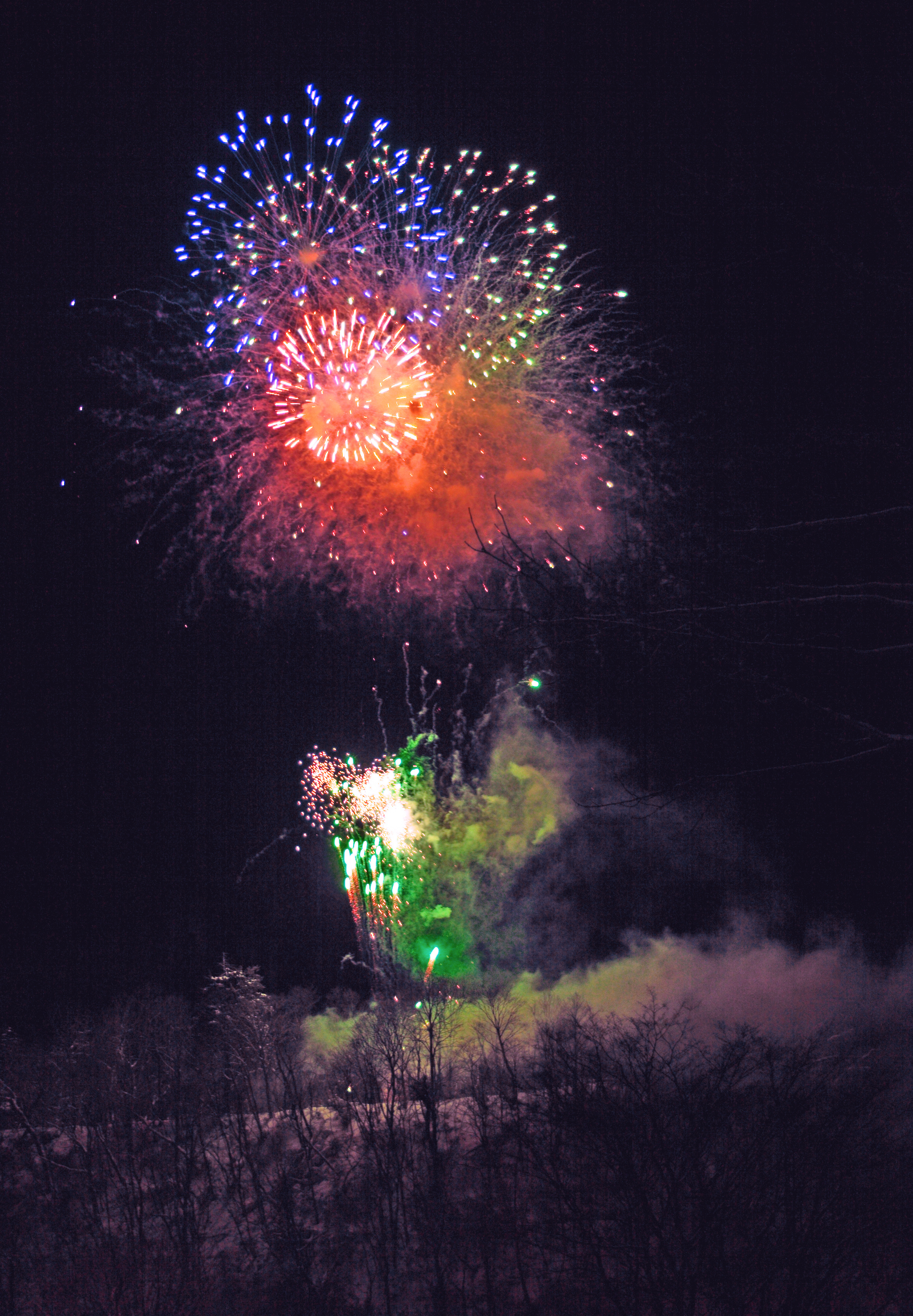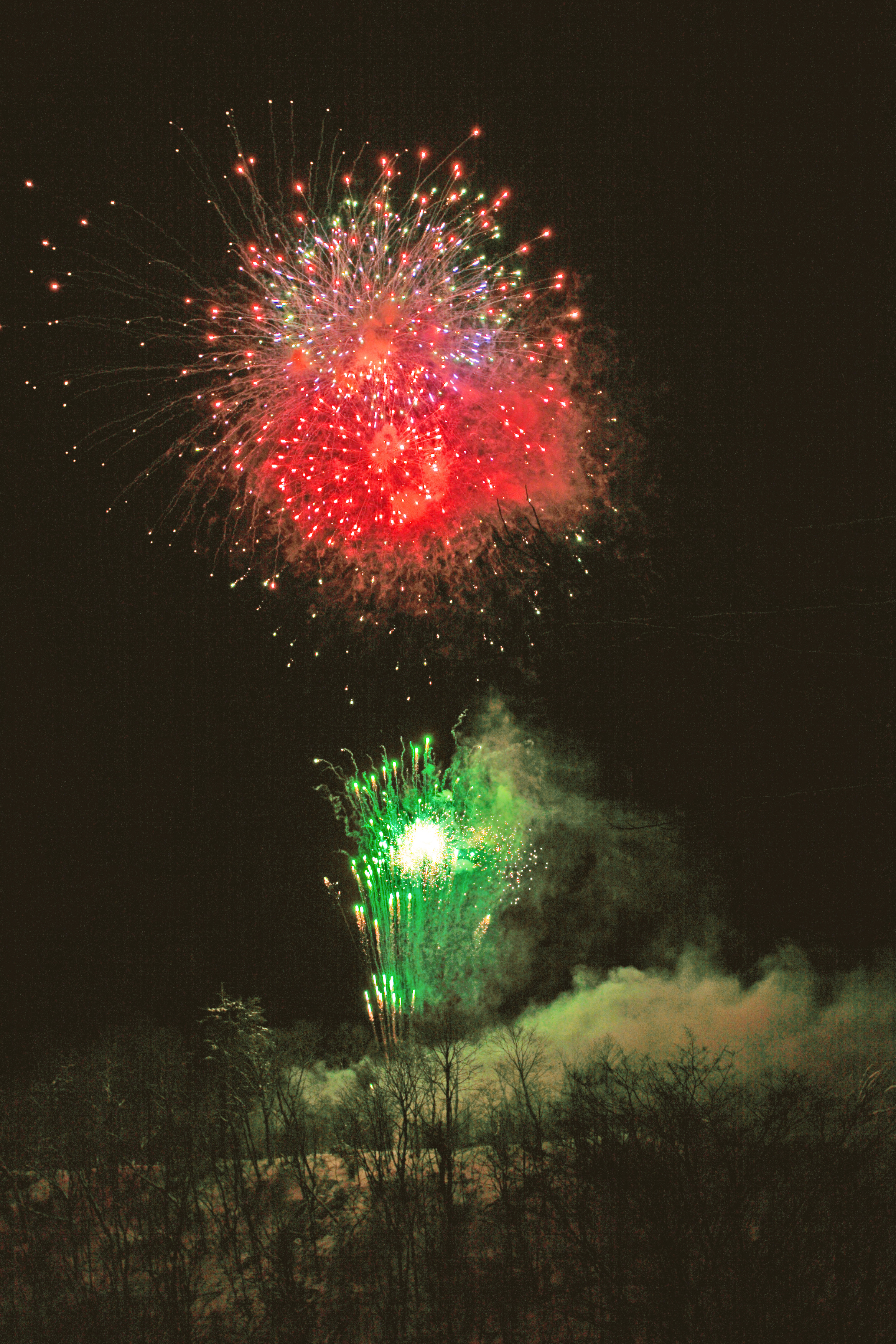 花火が点火すると、暗闇に一瞬だけ白い林が浮かび上がります。