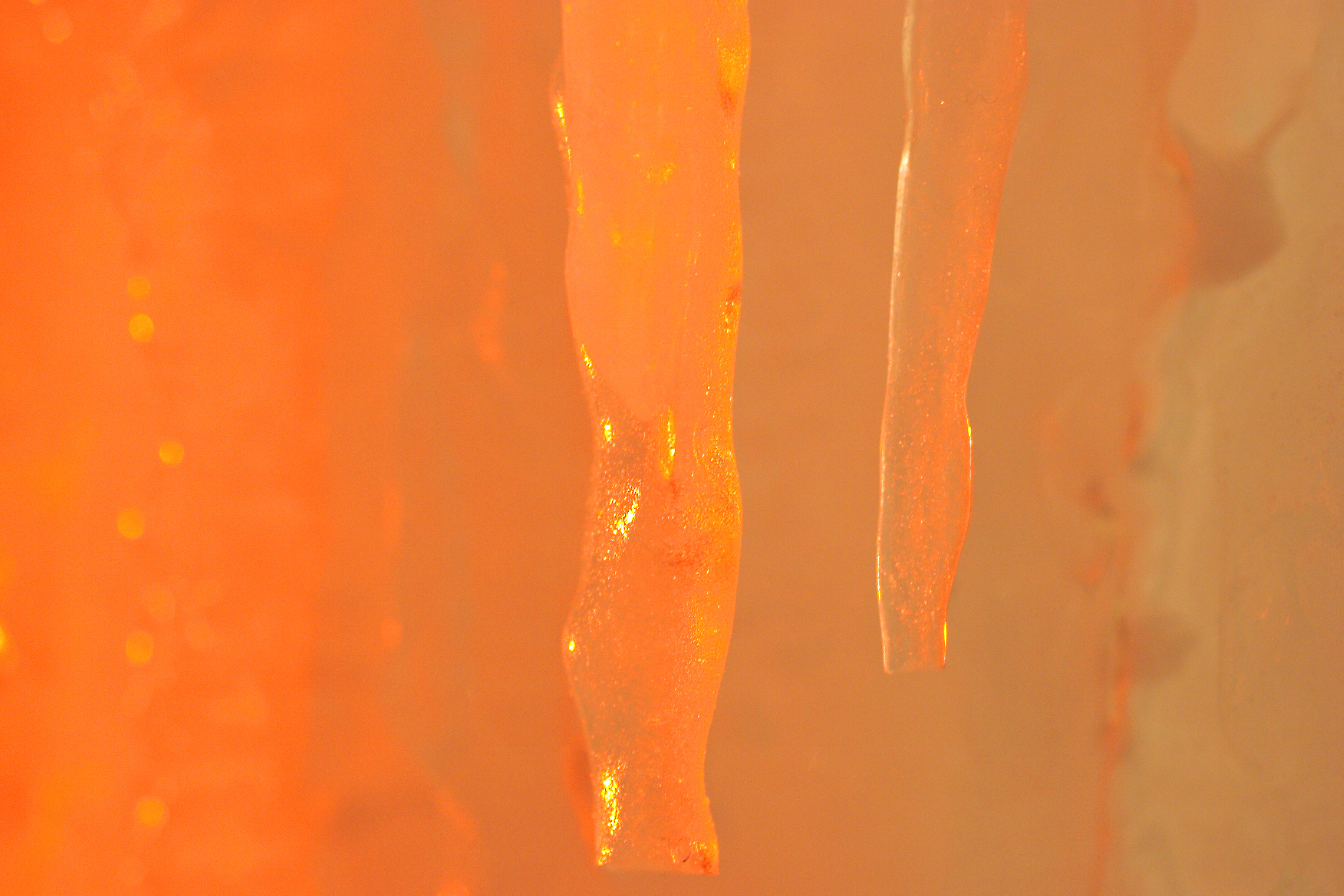 ライトアップでオレンジ色に輝く氷の柱。これはお祭り会場のゲートになっています。