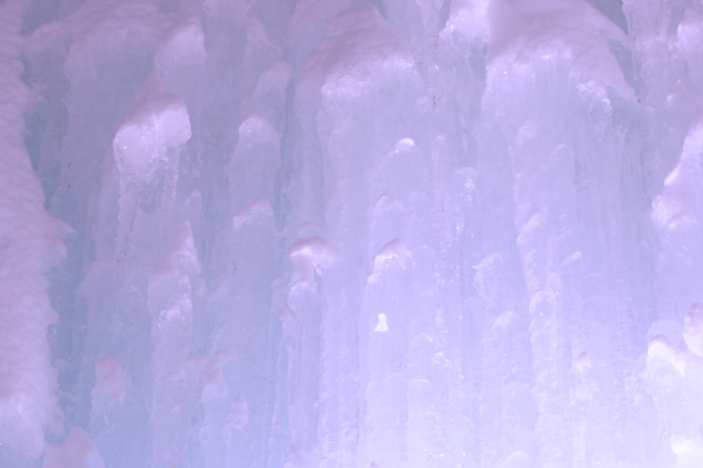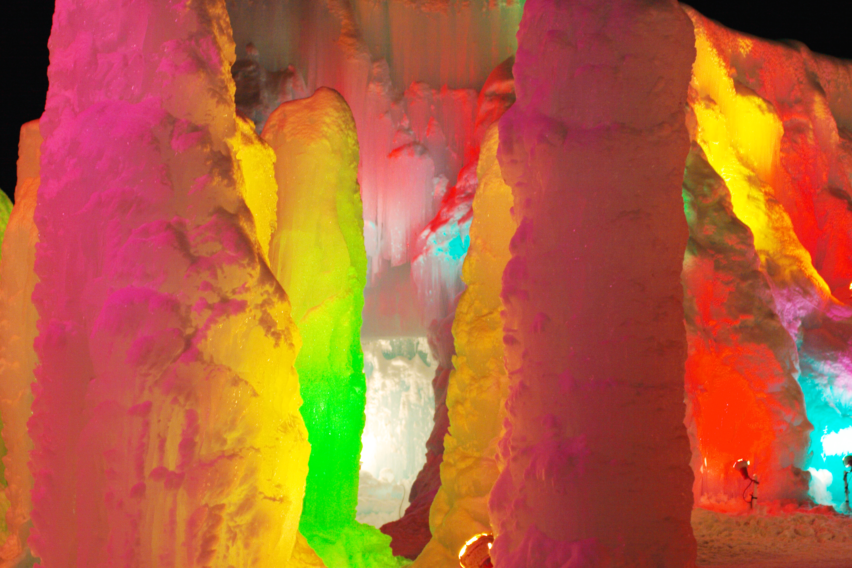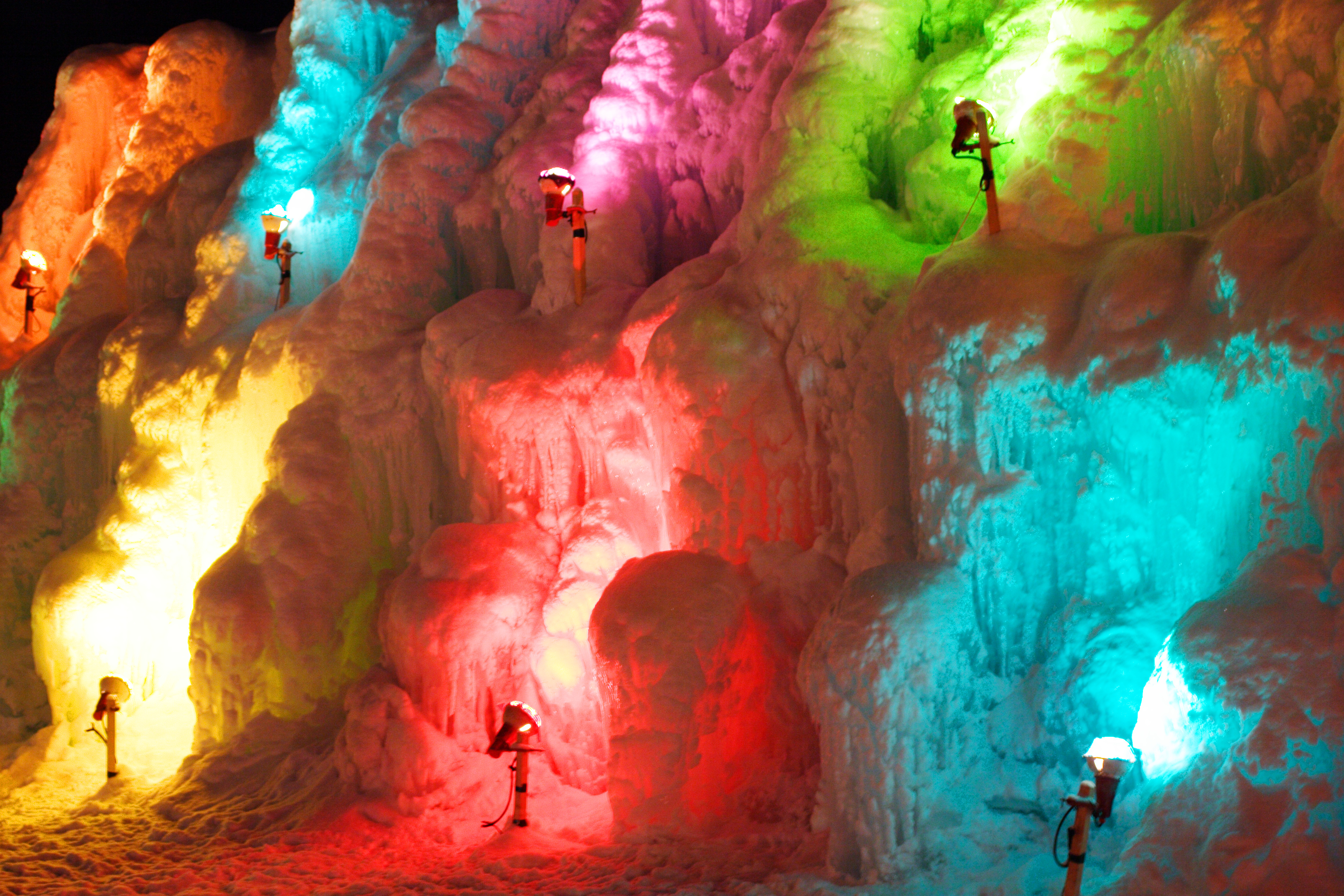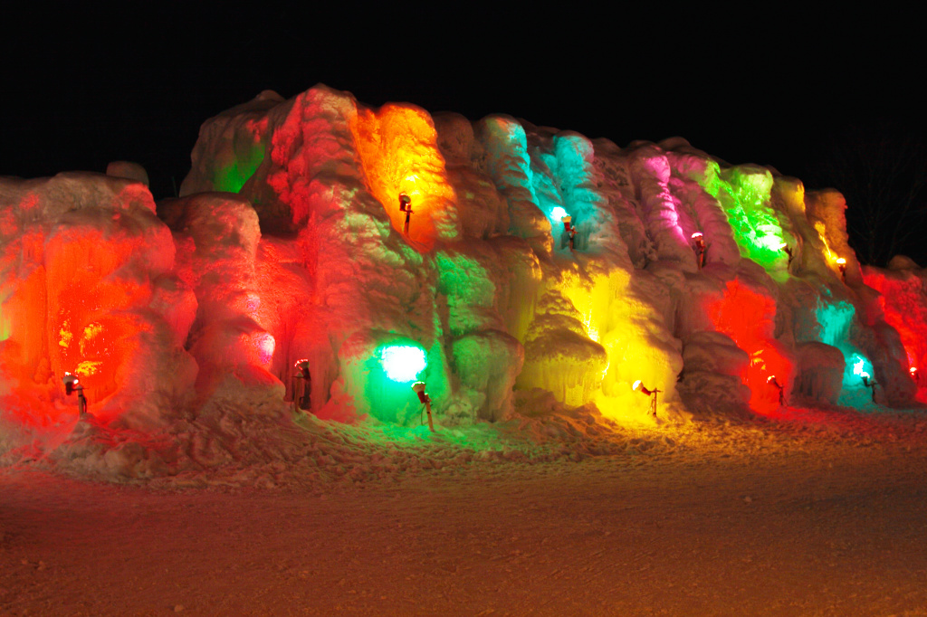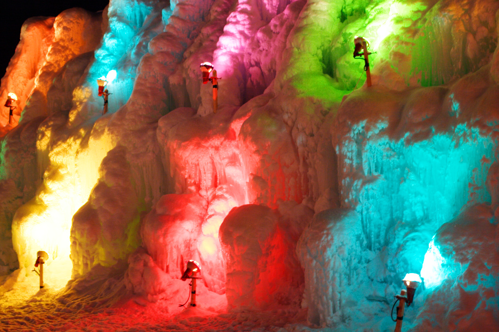 虹色にライトアップされた氷壁です。