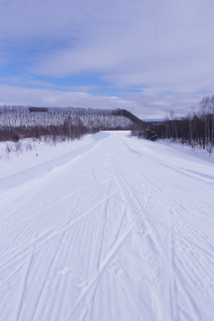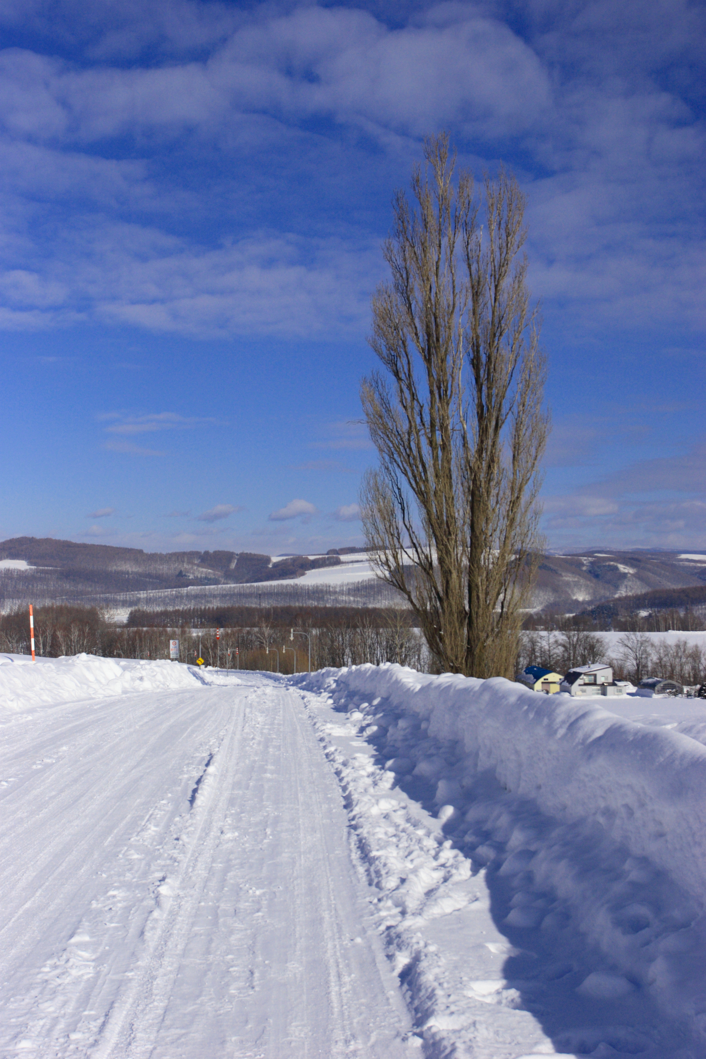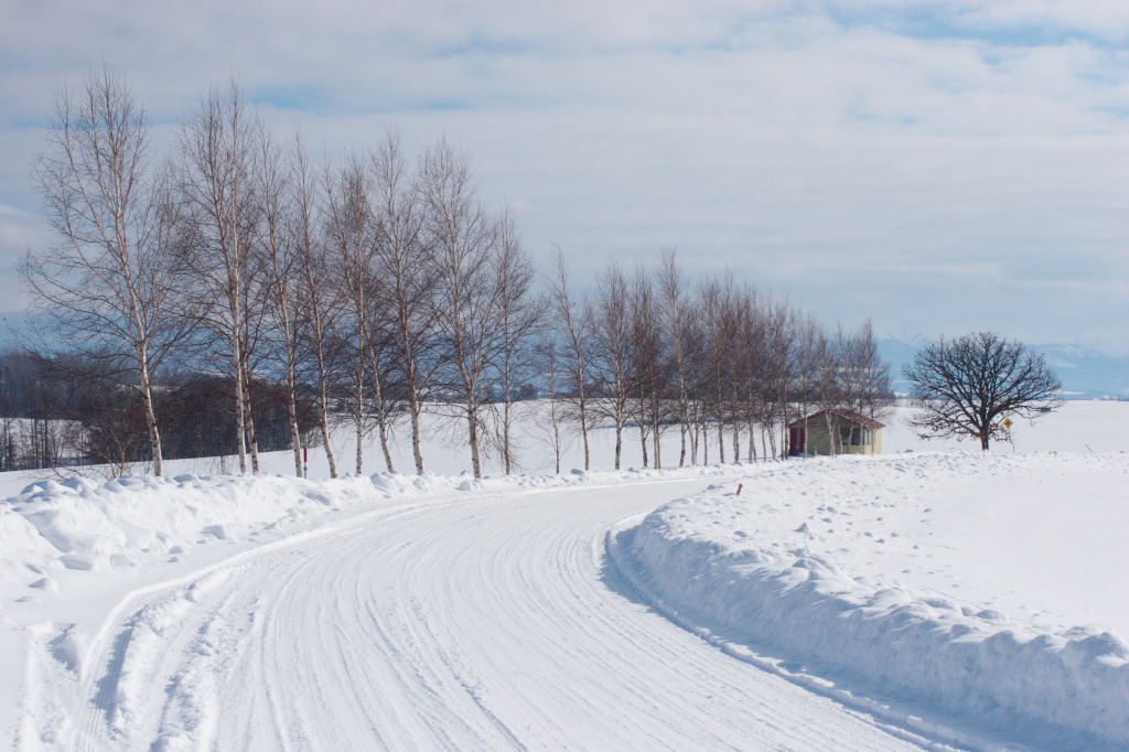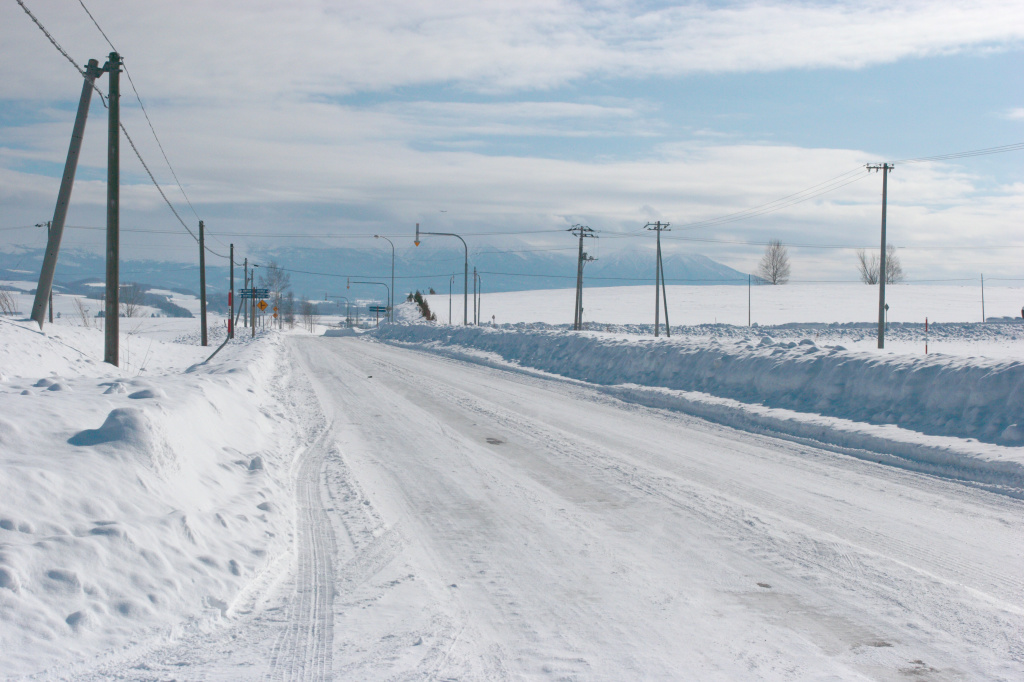 雪道に付いた幾筋かの轍が青冬空へと消えていきます。