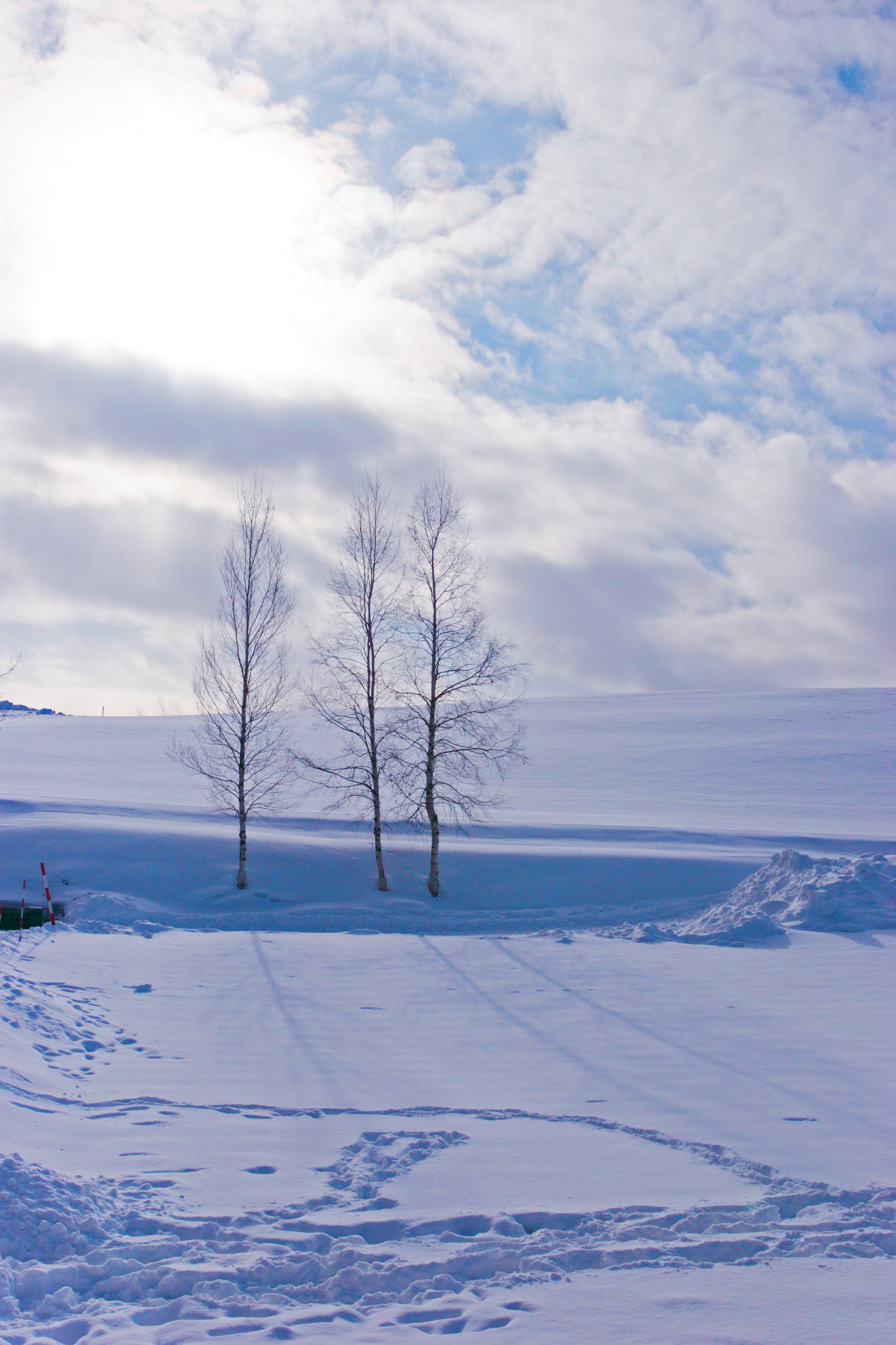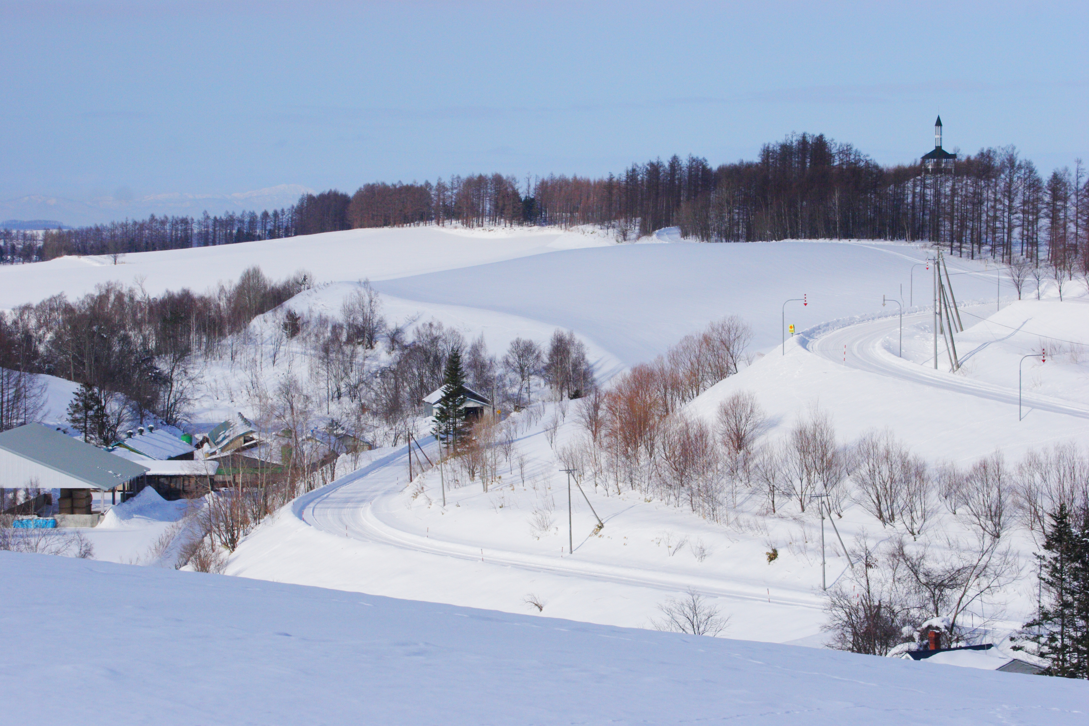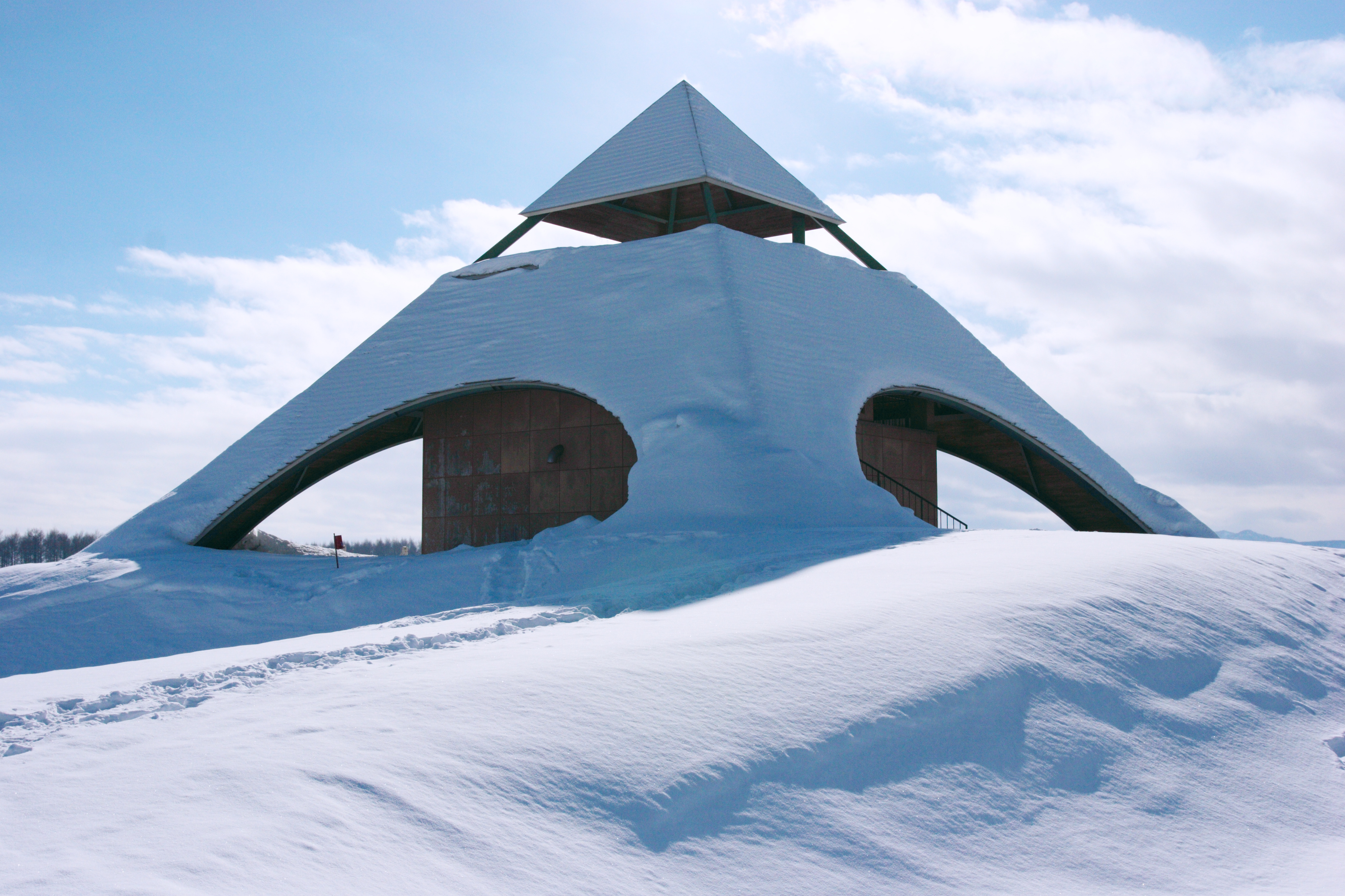 美瑛にある展望台です。冬季は閉鎖されています。雪の丘の中に、三角形の独特のシルエットが浮かんでいました。