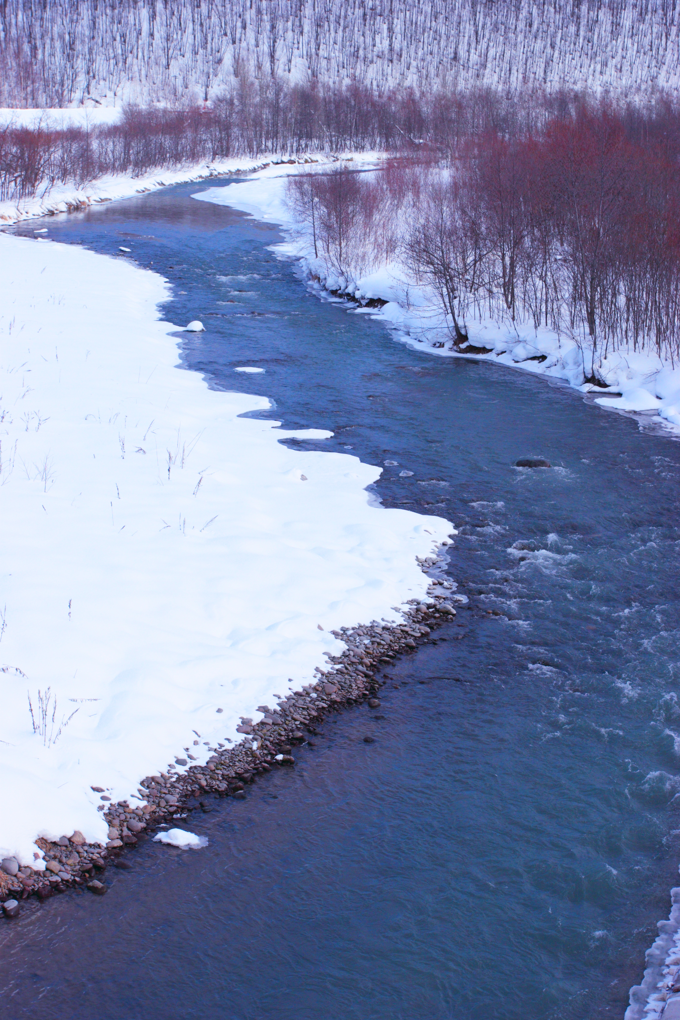 雪原の中をくねくねと曲がりながら流れていきます。