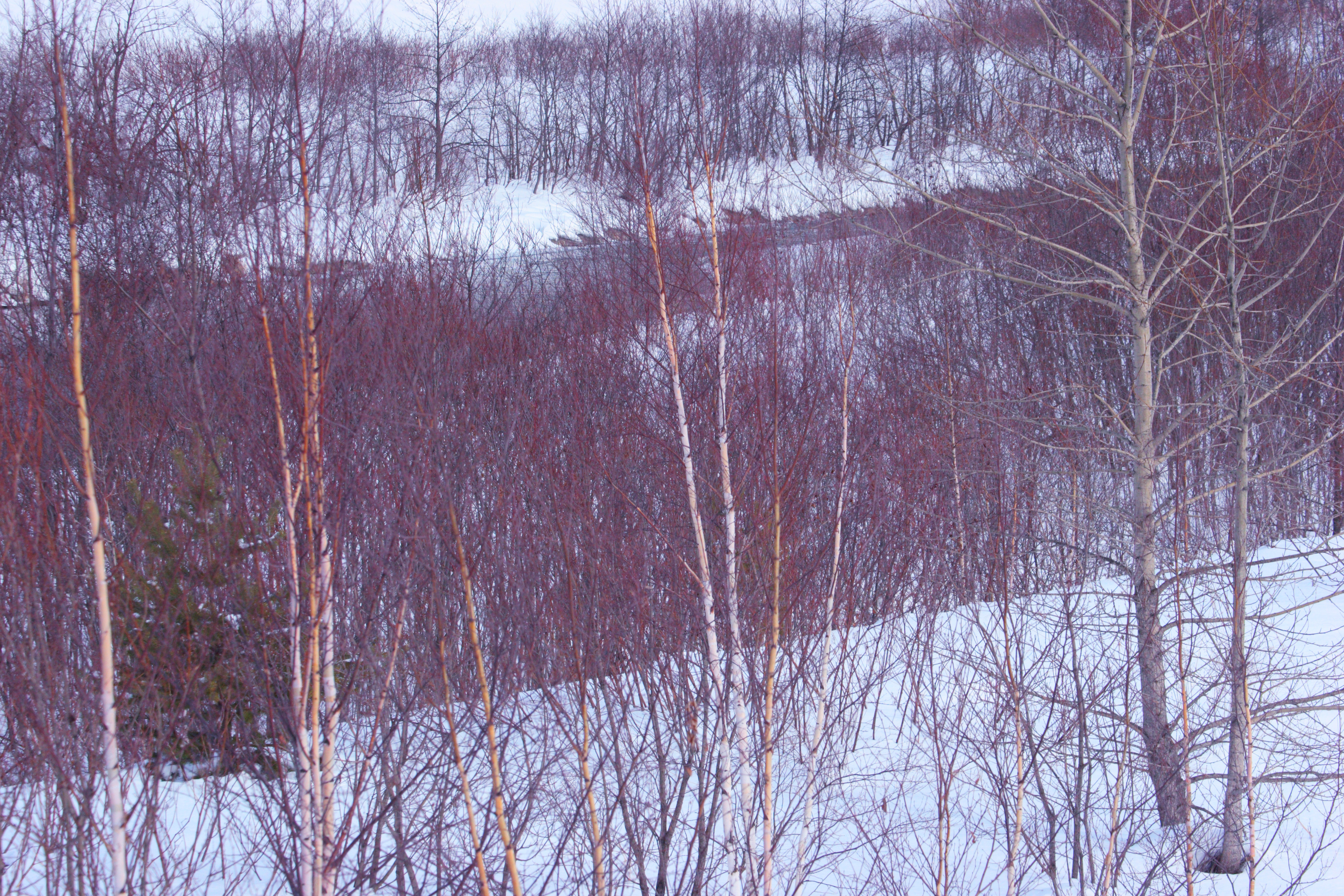 葉が落ちた灌木の列が、まるで雪にはしゃいで踊っているようです。