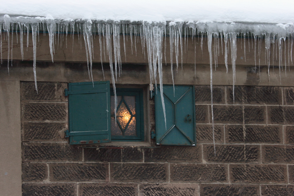 窓の明かりの外には、つららがたくさん並んでいました。