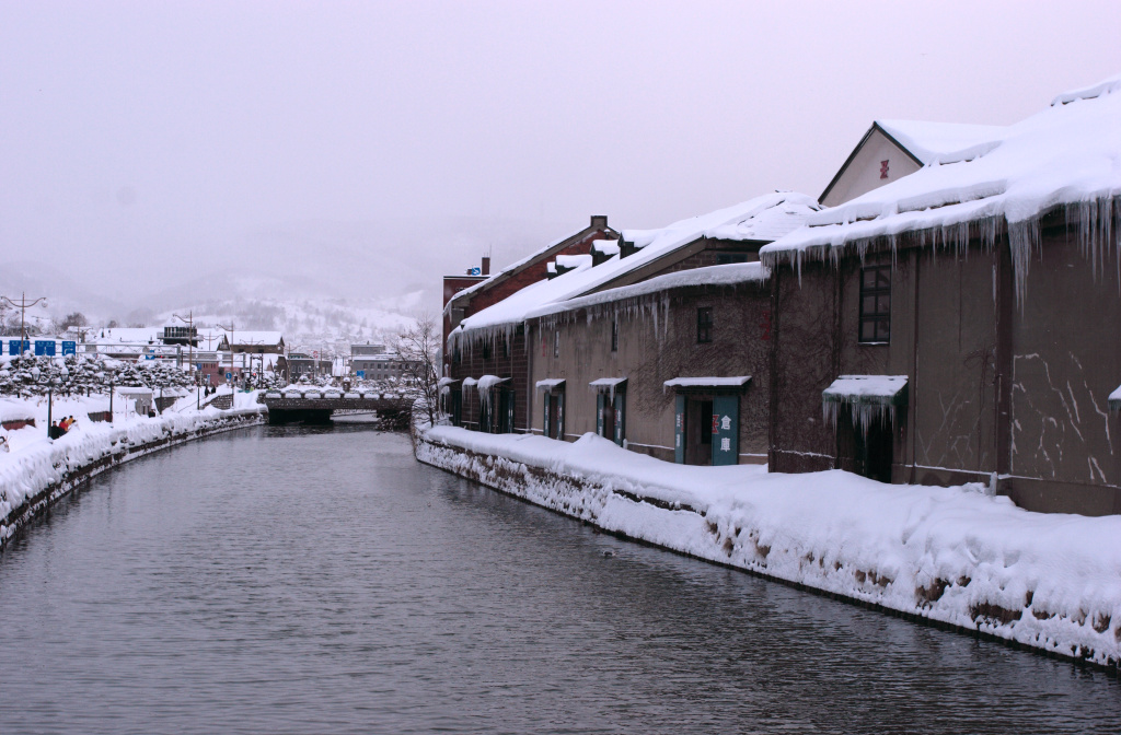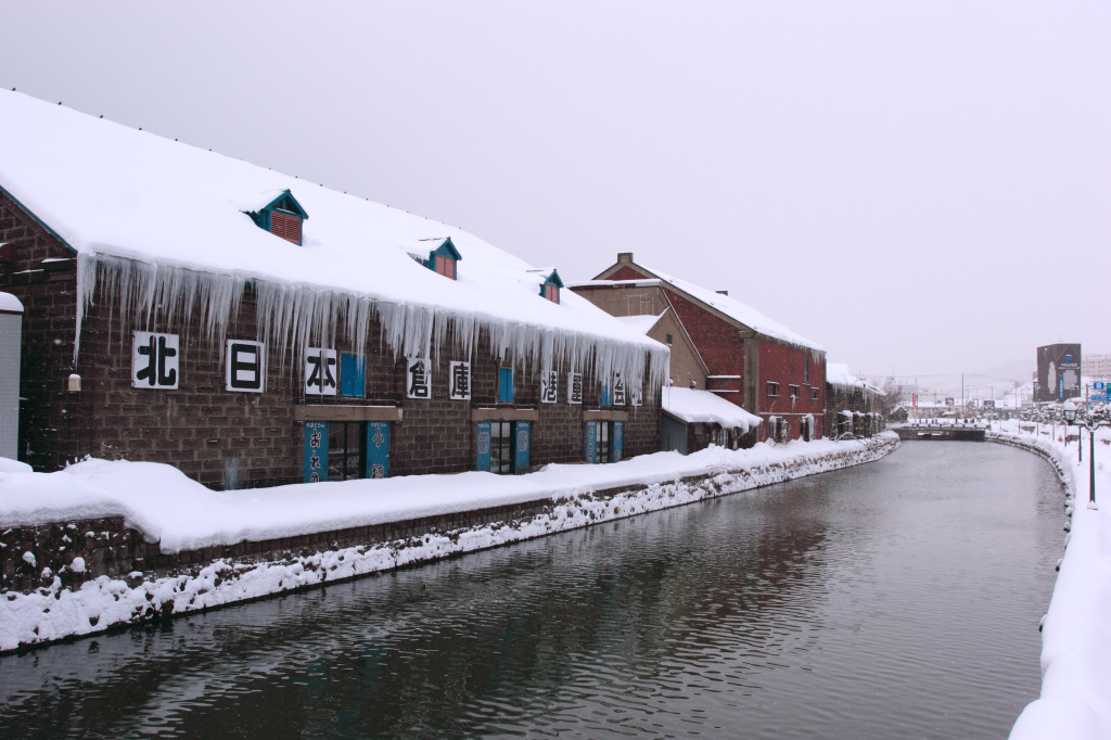 雪の小樽運河です。倉庫の軒先のつららの見事なこと。