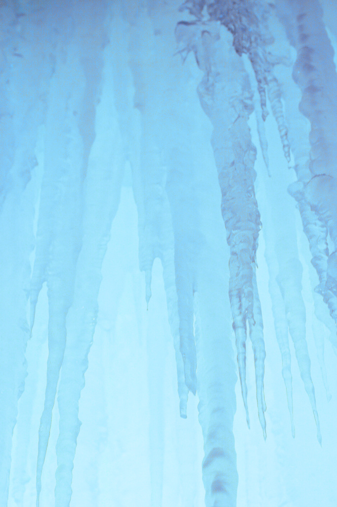 幾本もの氷柱が垂れ下がった氷の洞窟。すべてが凍り付いた世界の静寂。
