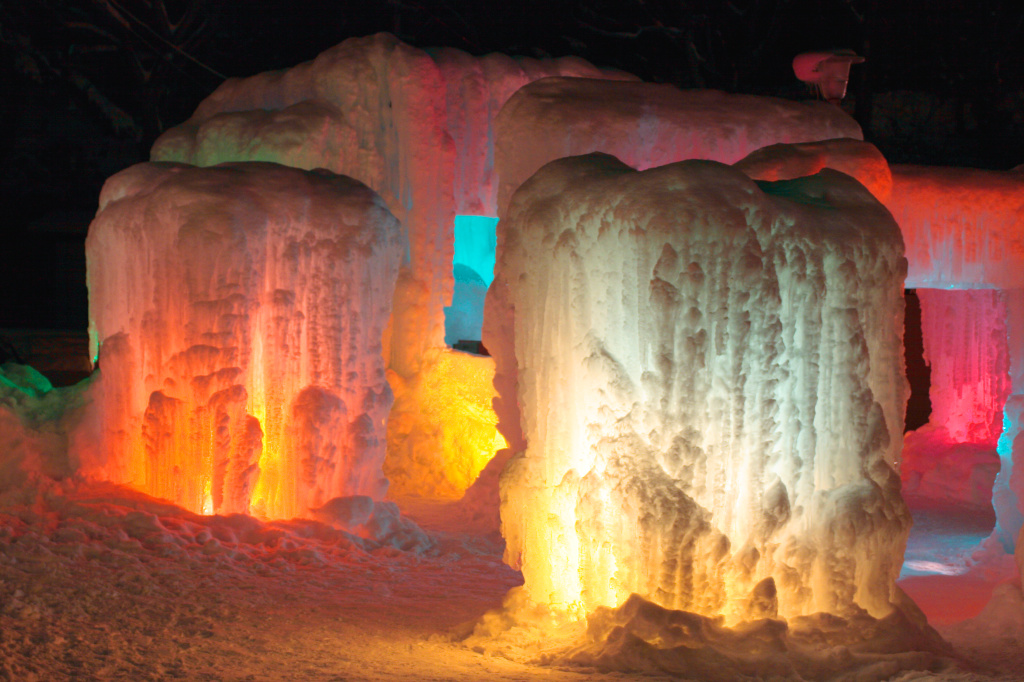氷のお城の入り口付近を撮影しました。ライトの色がとても鮮やかで、まるでおとぎ話の国の入口です。