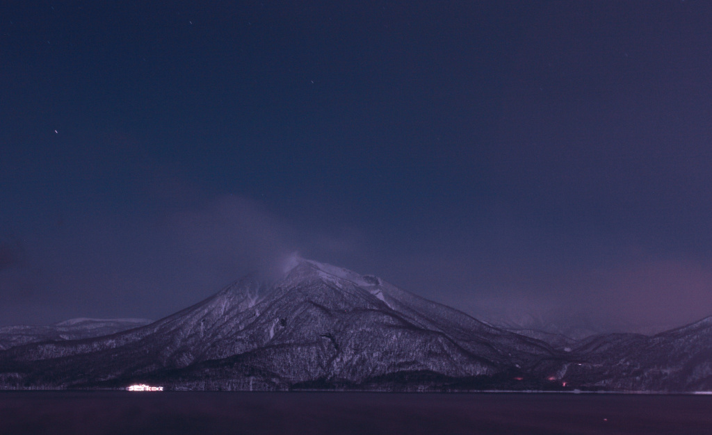 支笏湖の対岸にそびえる恵庭岳の夜景です。札幌は吹雪ですが、一山越えた支笏湖は晴れています。カメラで長時間露光すると、肉眼では見えない恵庭岳が浮かび上がります。