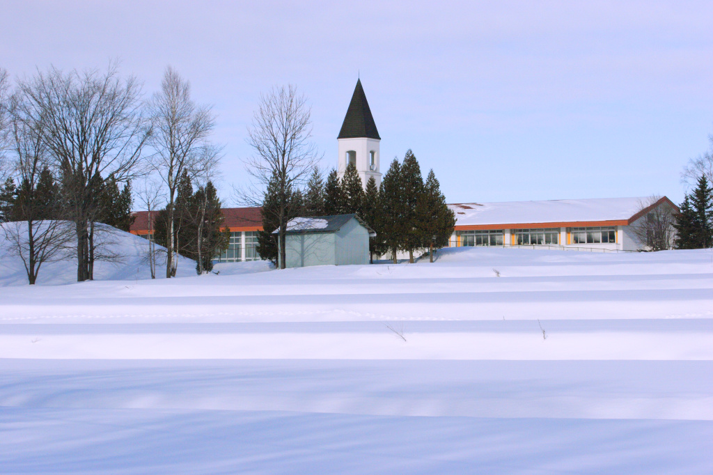 段々になった雪の斜面には、三角屋根がシンボルの学校があります。