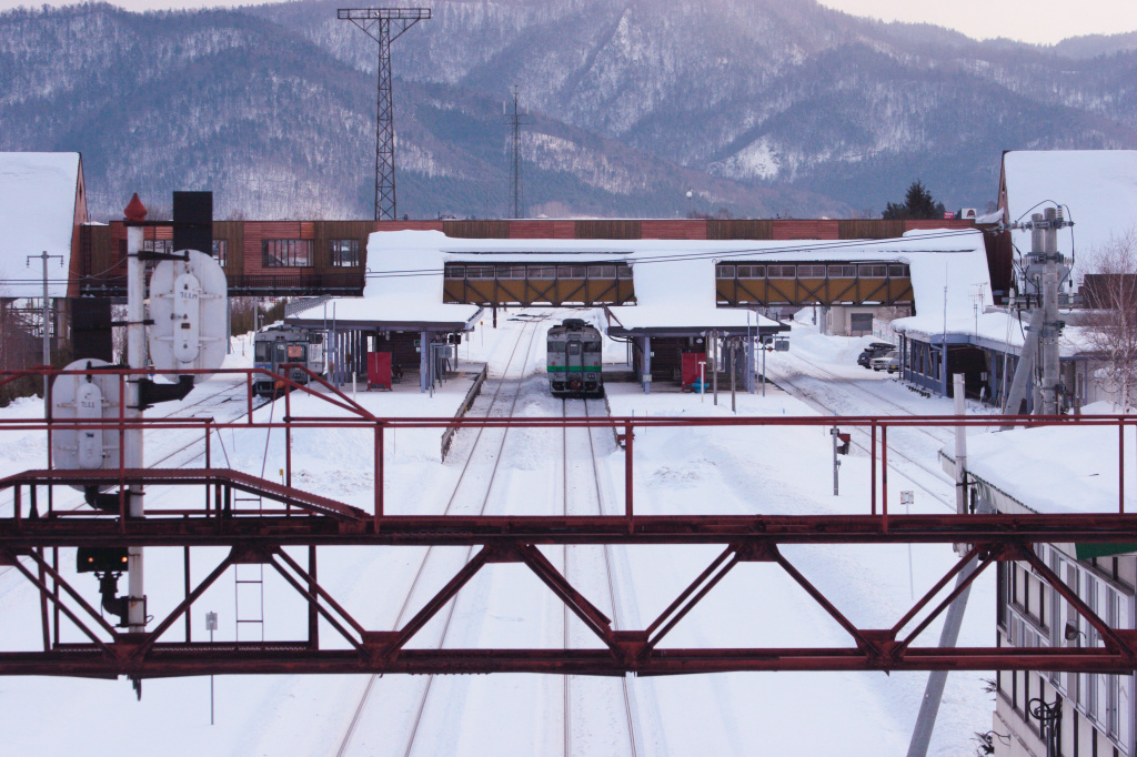 冬の富良野駅です。1両編成の列車が休んでいます。