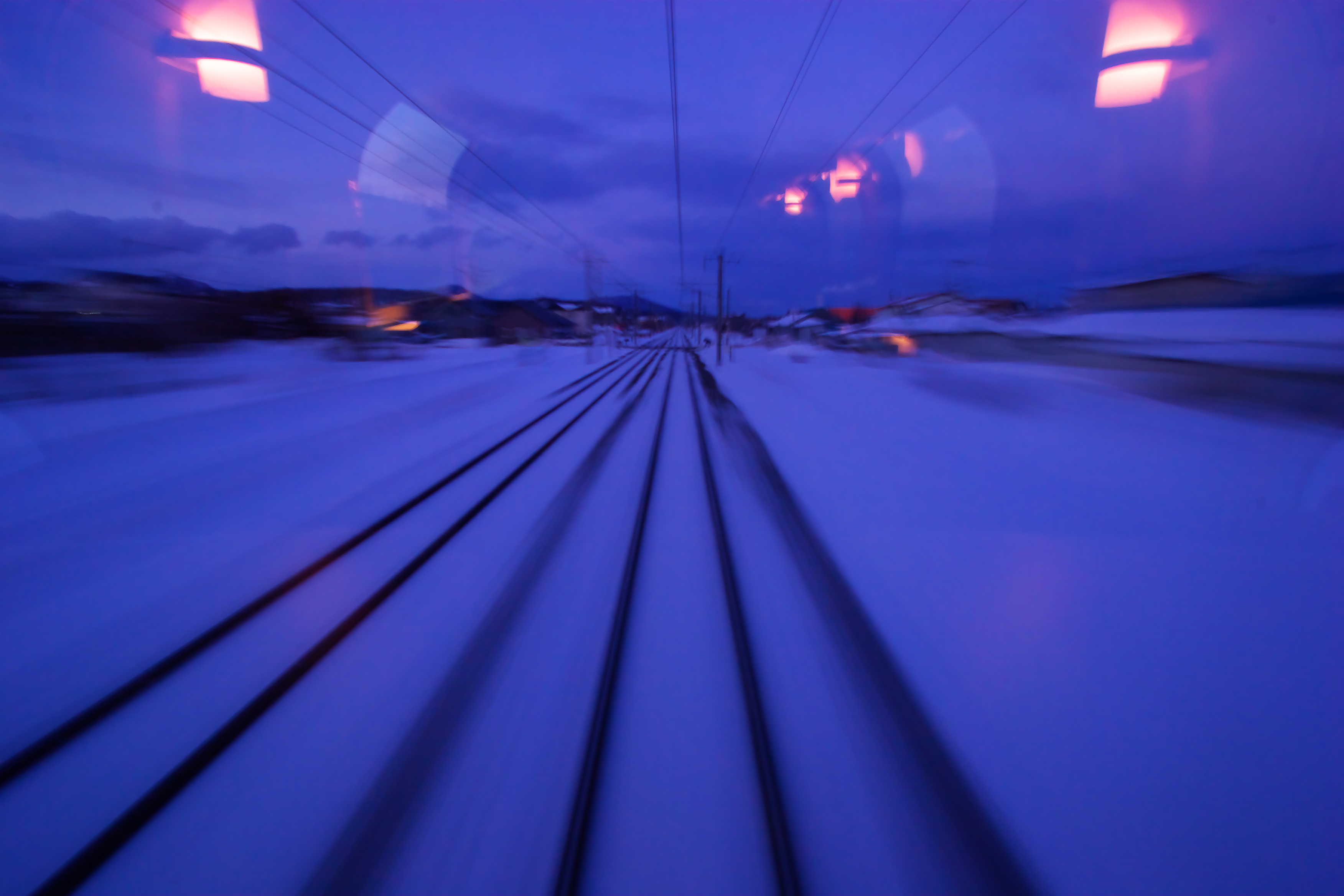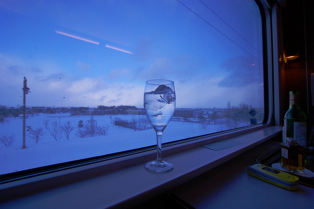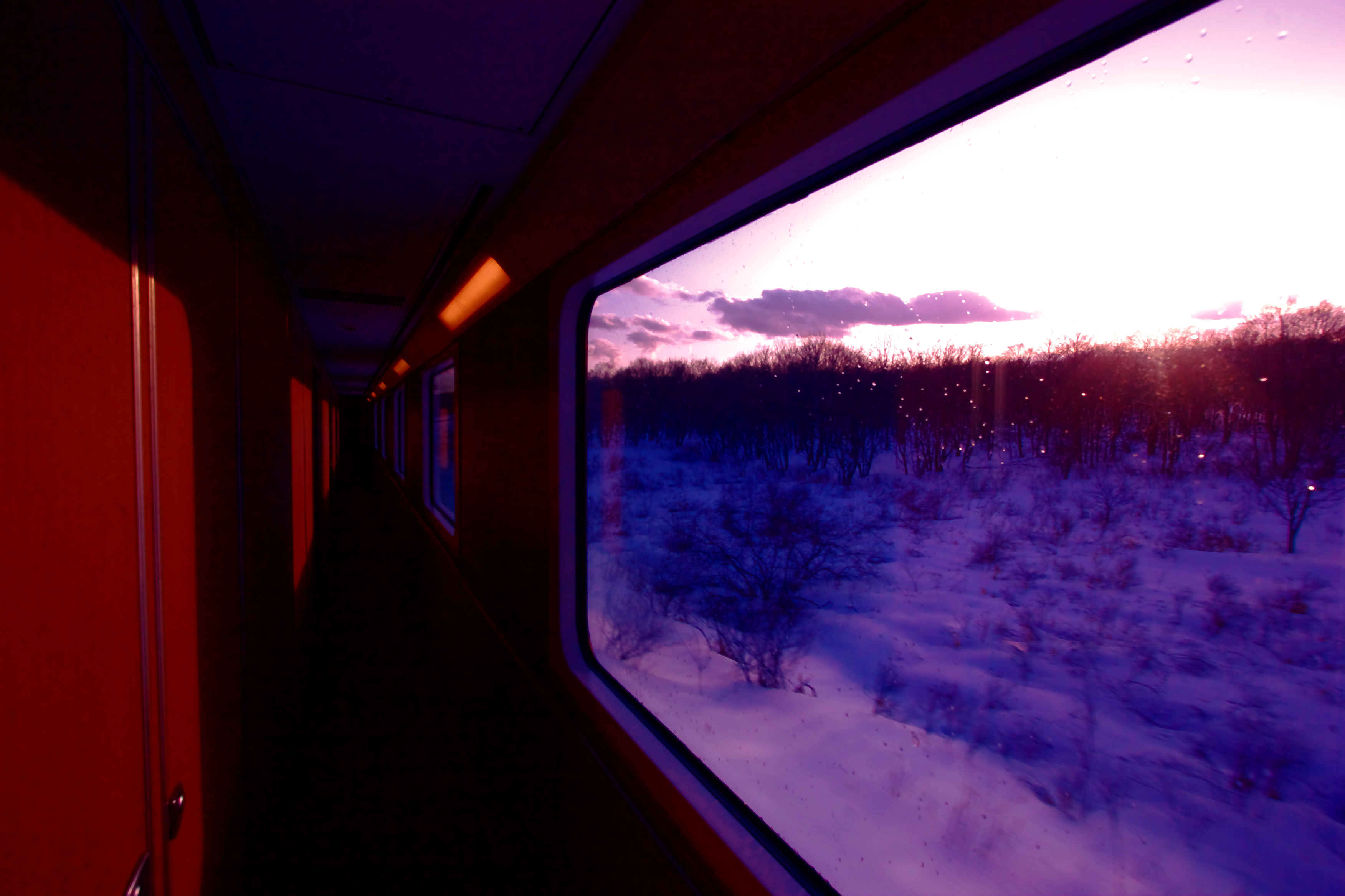 雪原に夕陽が落ちていきます。寝台特急の窓から、今日最後の陽が深々と差し込んできます。