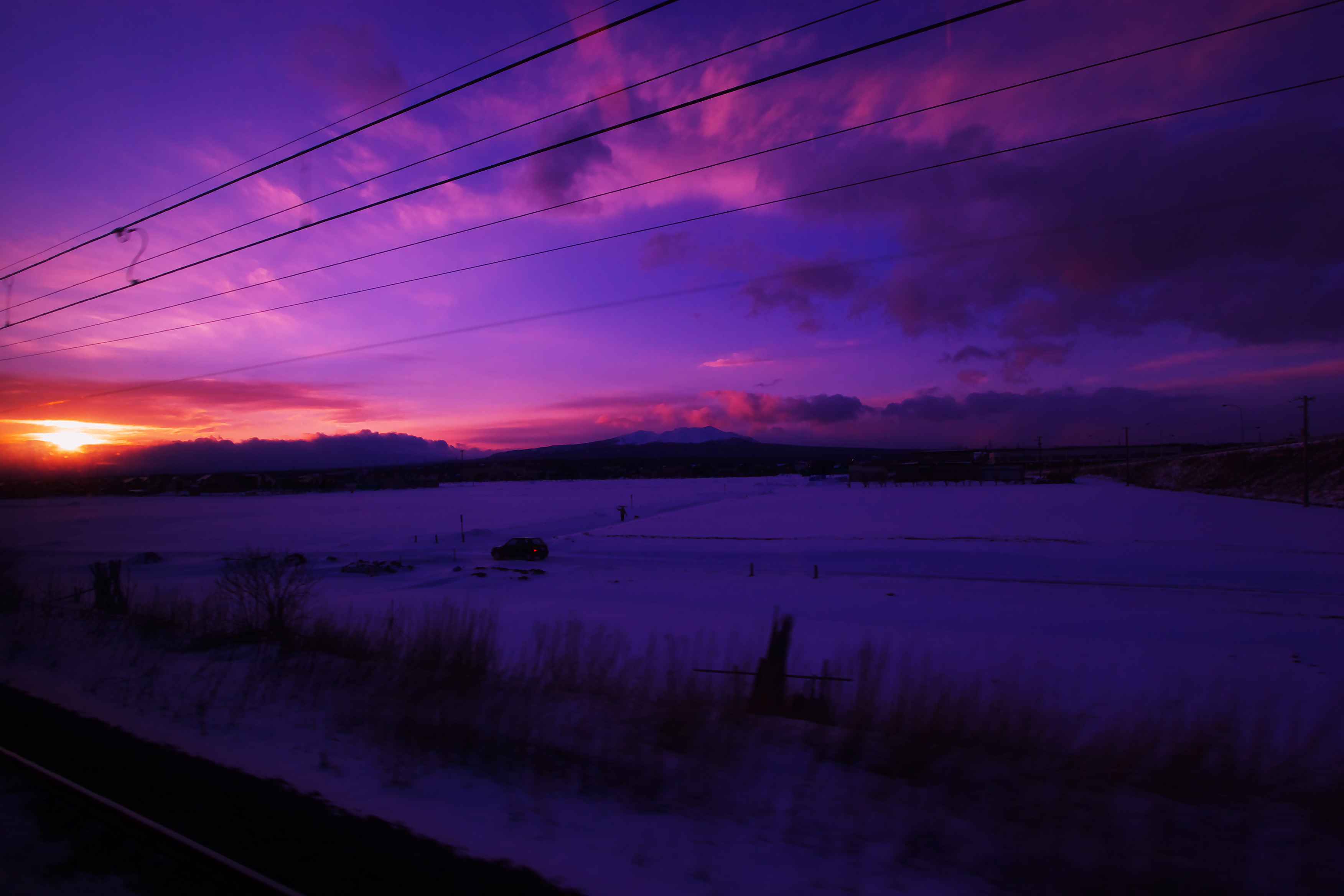 列車の窓から見える綺麗な夕焼けです。北の大地にとっては平凡な冬の一日に過ぎません。ぽつんと車が止まっています。