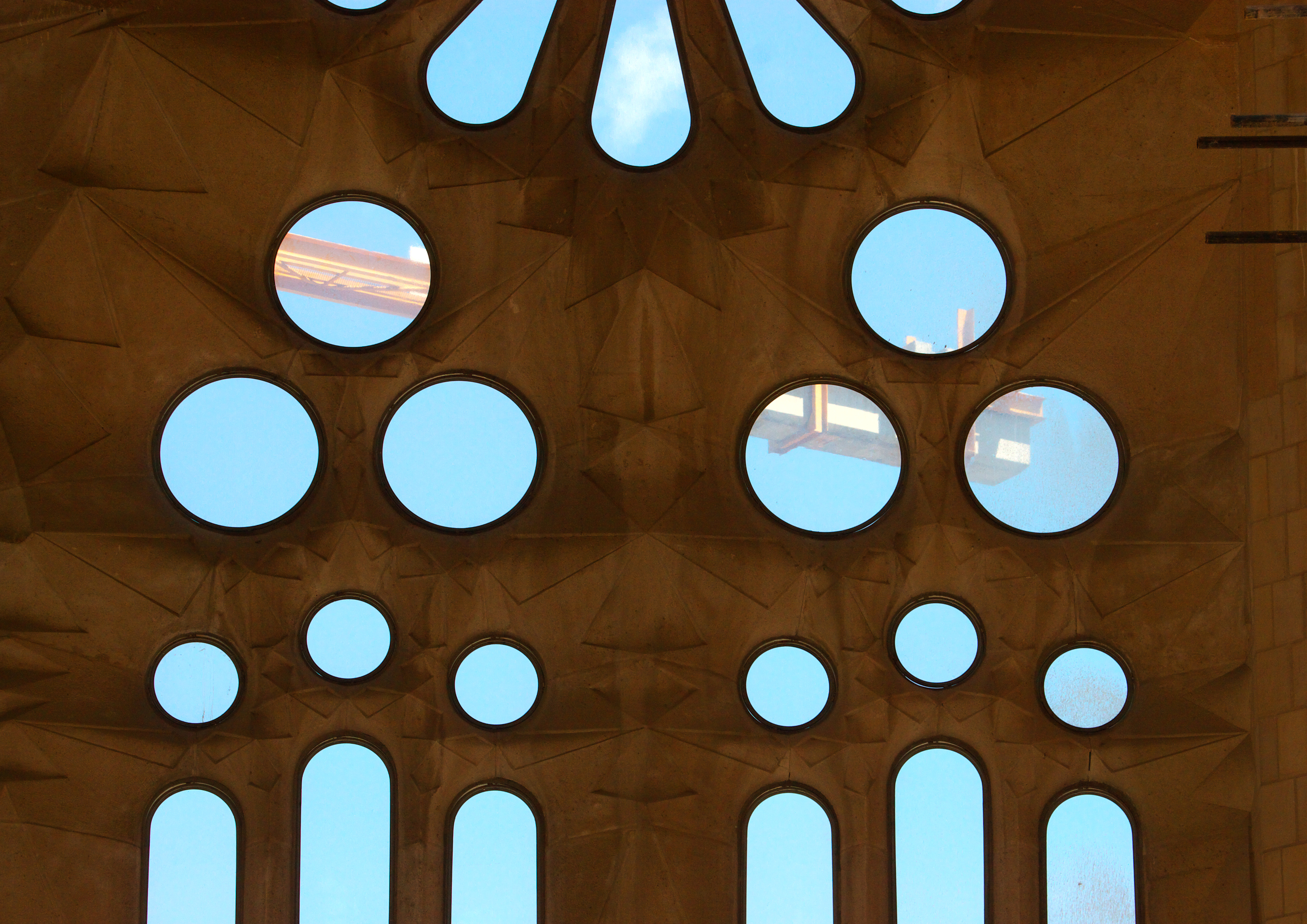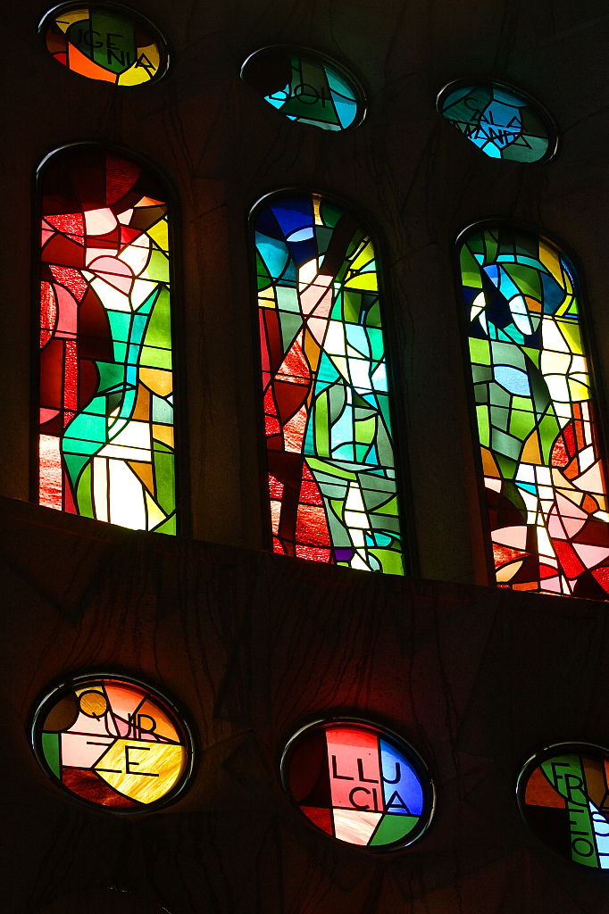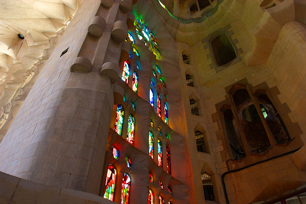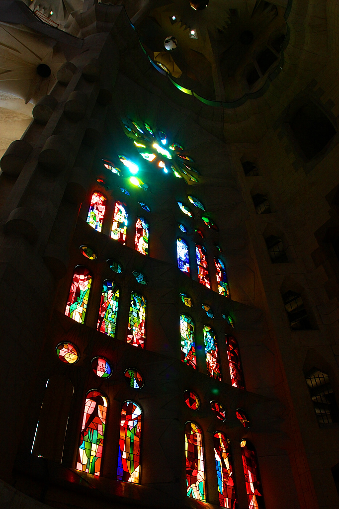 サグラダ・ファミリアのステンドグラスです。明るい光が注ぐ中にあるので、一風変わった光景になっています。