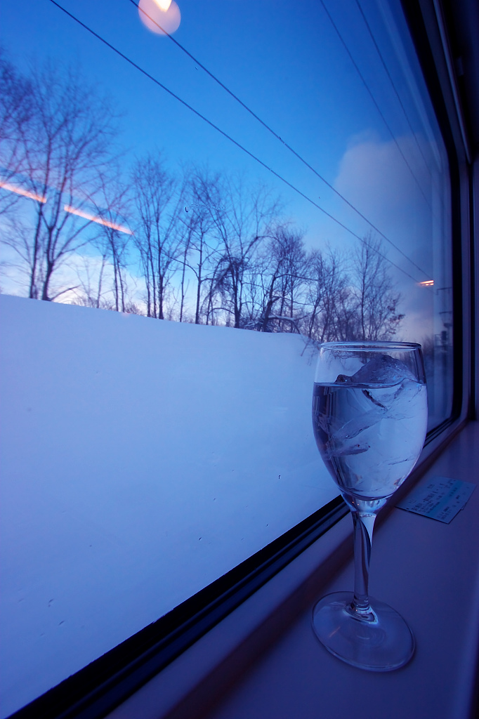 寝台特急の窓辺に置かれたグラス。青い空の下、雪の林を駆け抜けていきます。