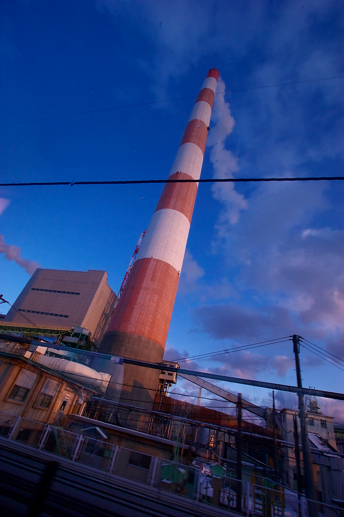 苫小牧駅の脇に建っている巨大な煙突を、車内から撮影しました。