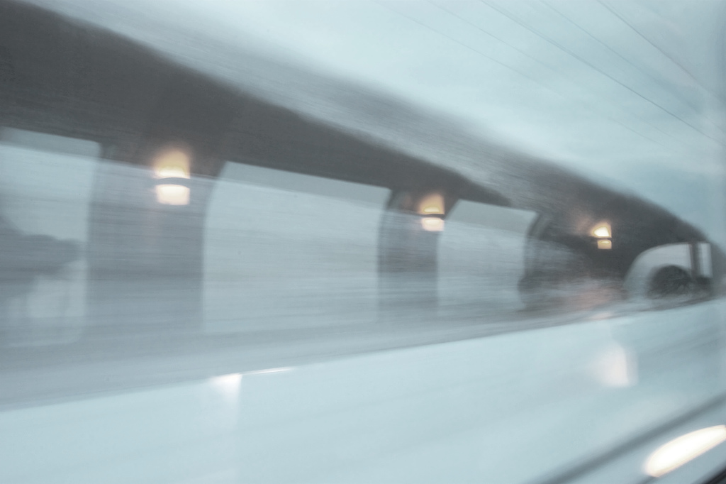 粉雪が舞っていく車窓のひとこまです。車内の様子が雪のスクリーンに反射しています。