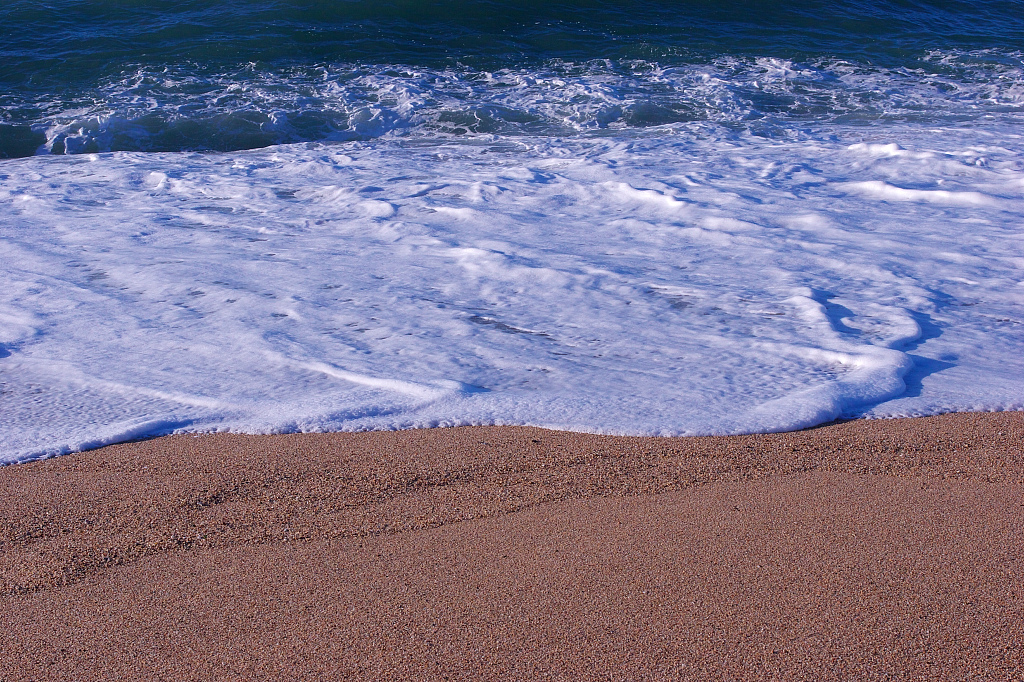 引いていく波です。砂浜、波、ぬれた砂の部分の3段階になっているコントラストが面白いです。