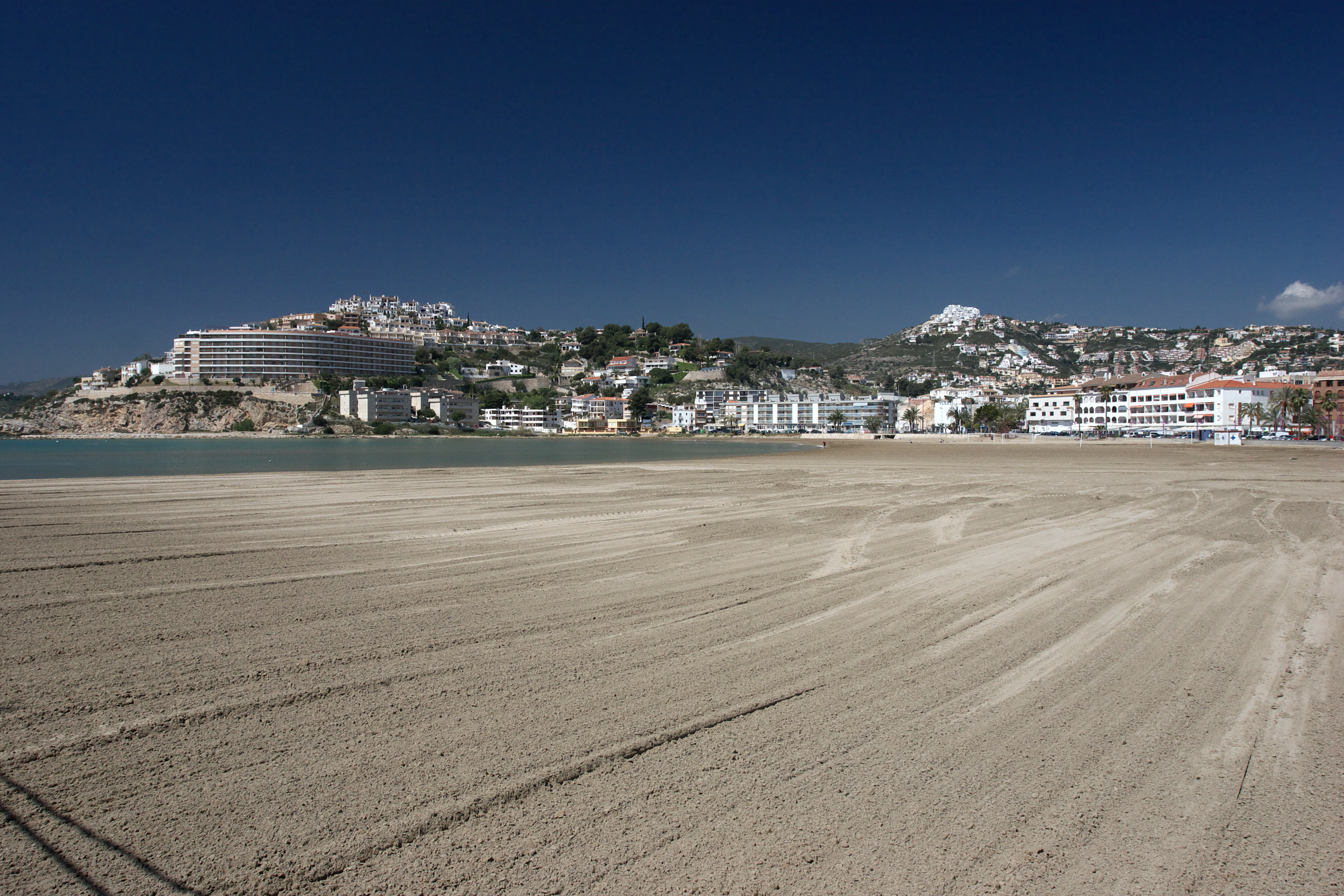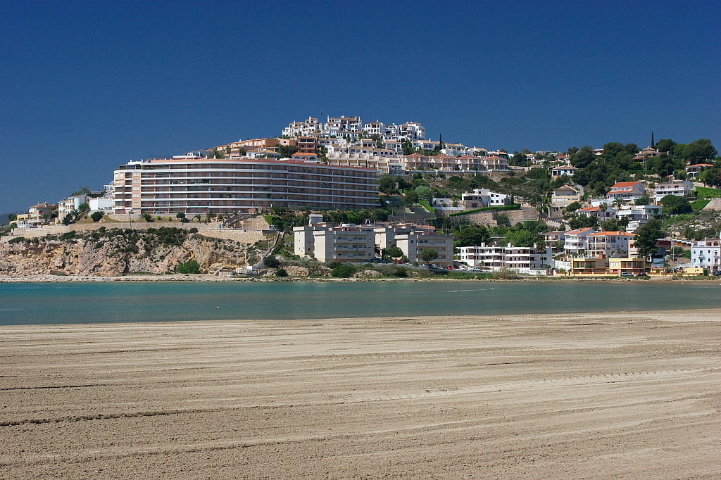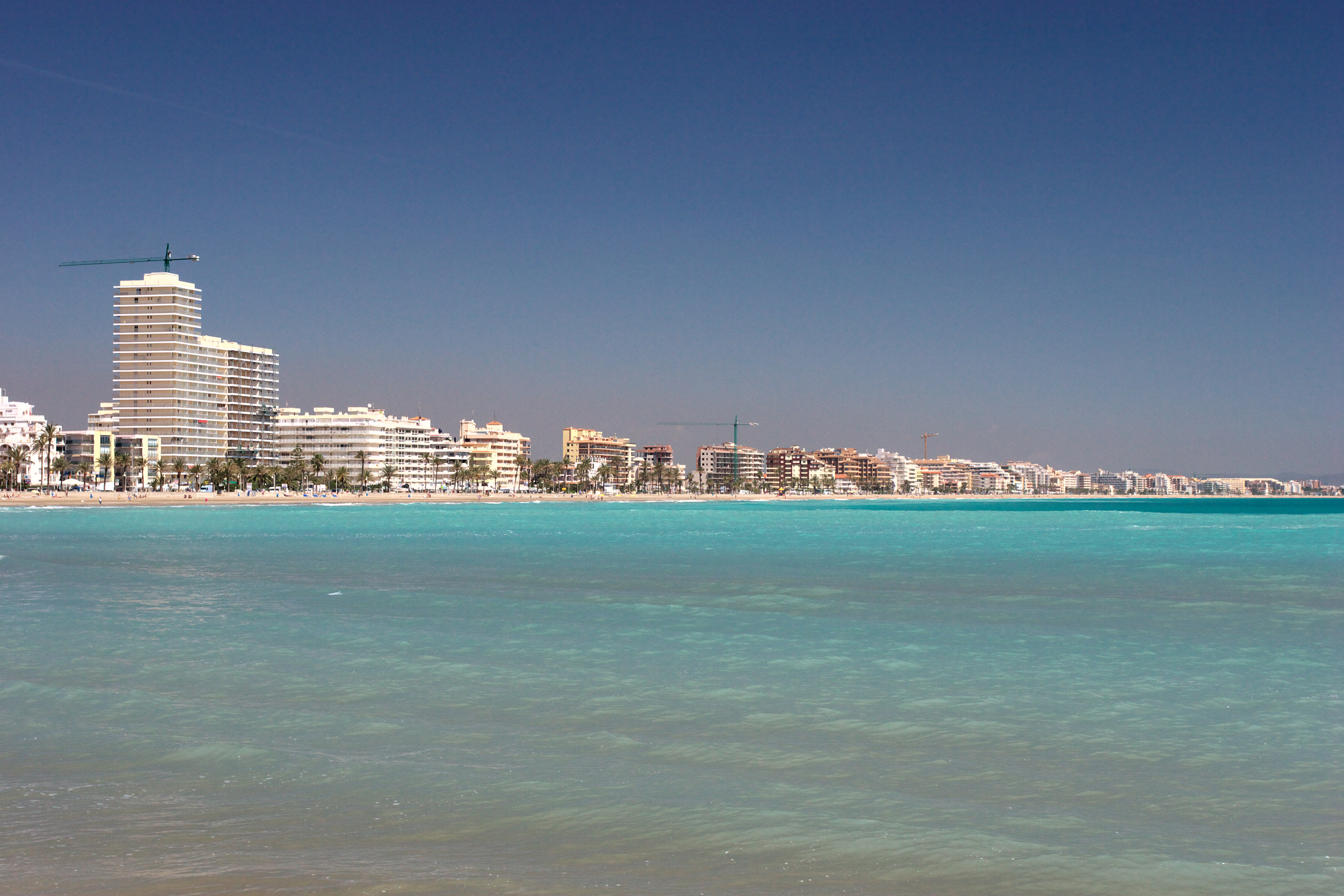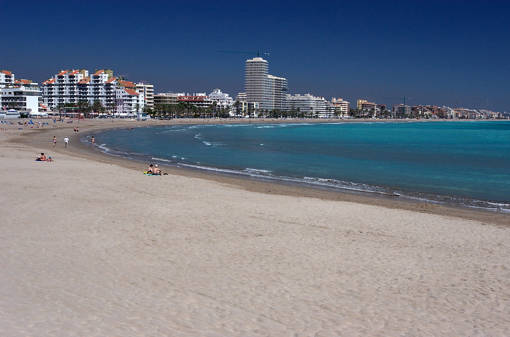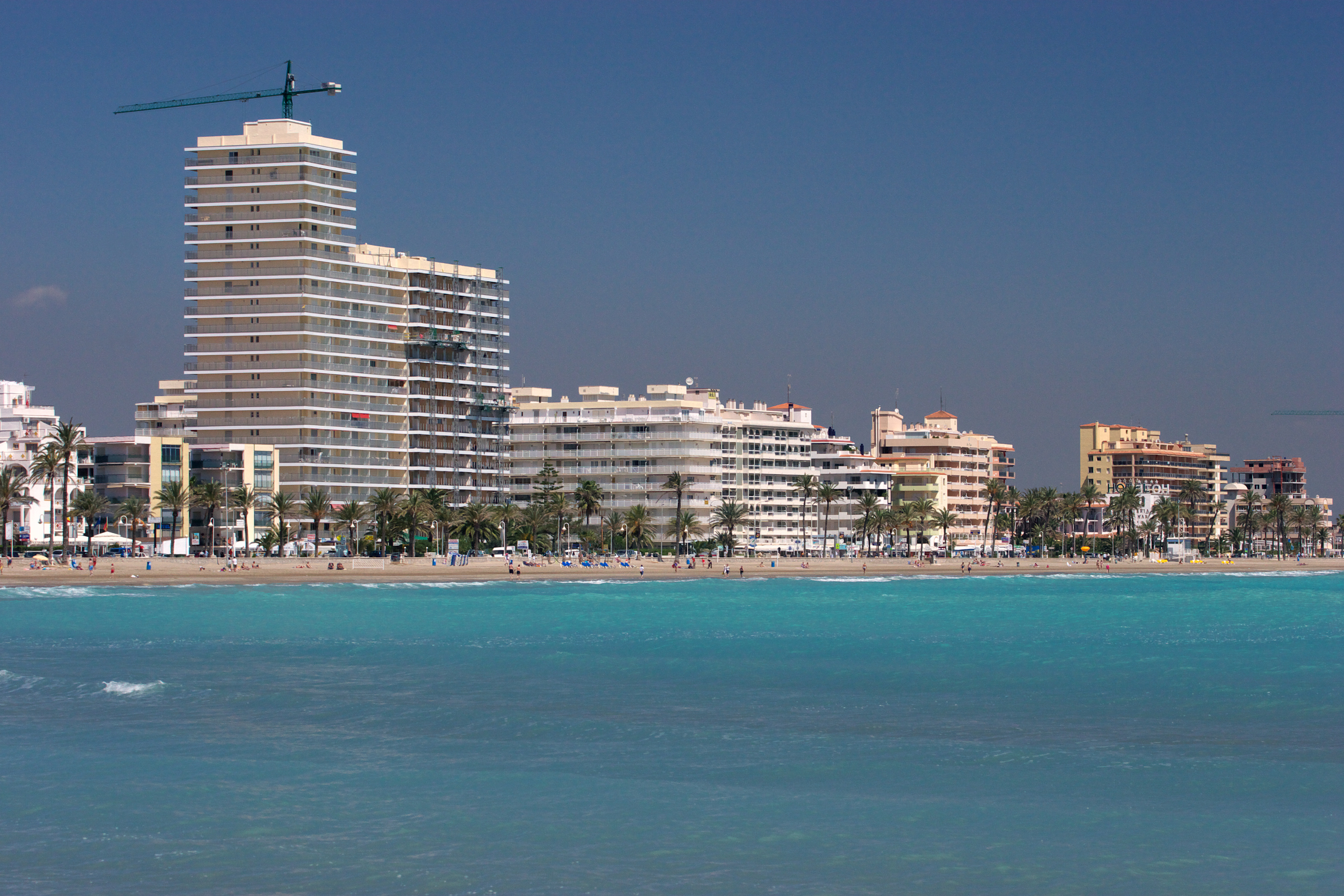 地中海のリゾート地です。青い海、白い砂浜、建ち並んだホテル。日光浴をする人々。