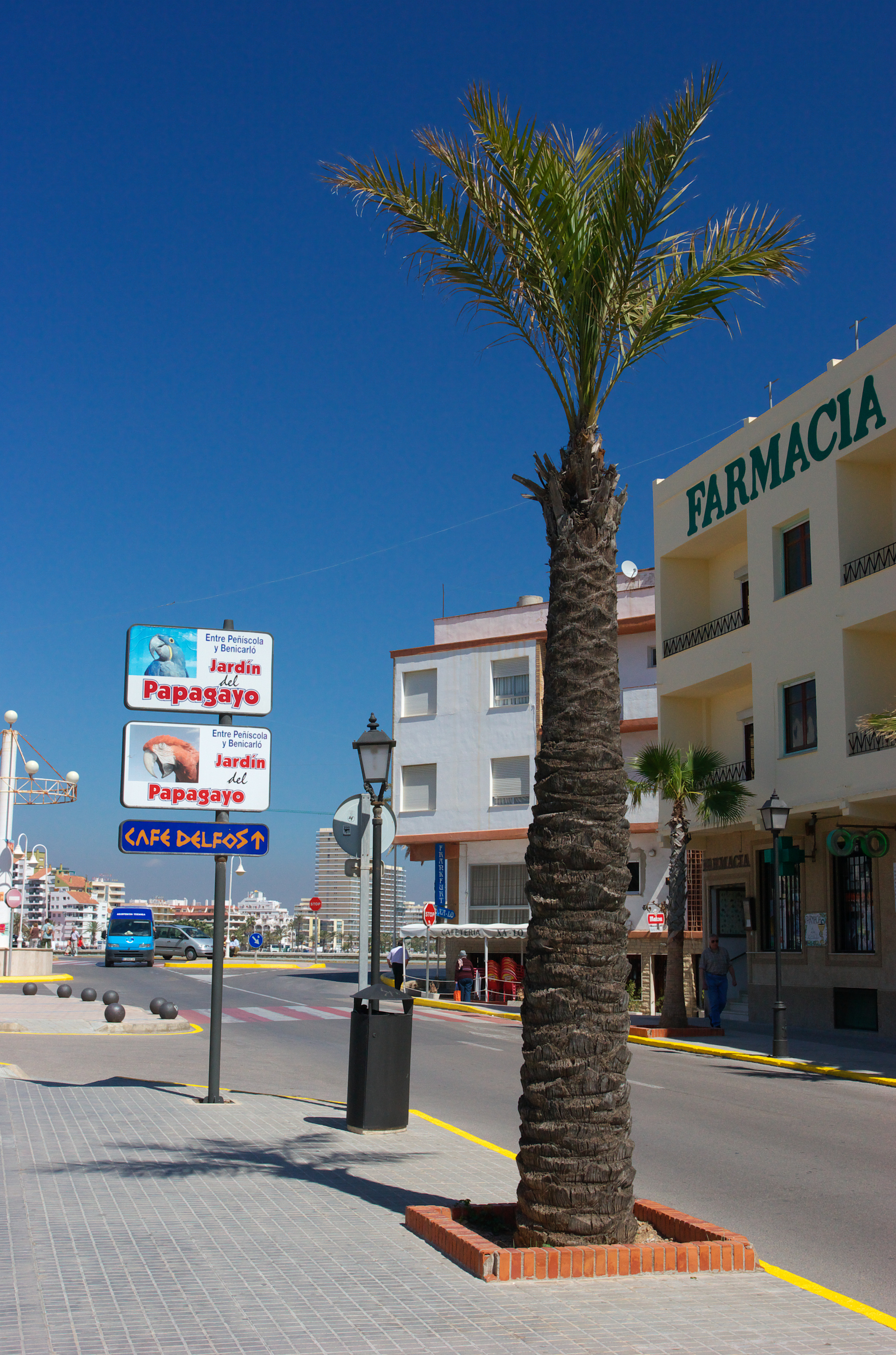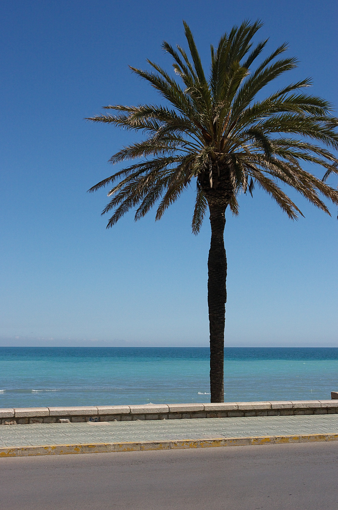 路の脇にある1本の椰子。地中海を見つめています。