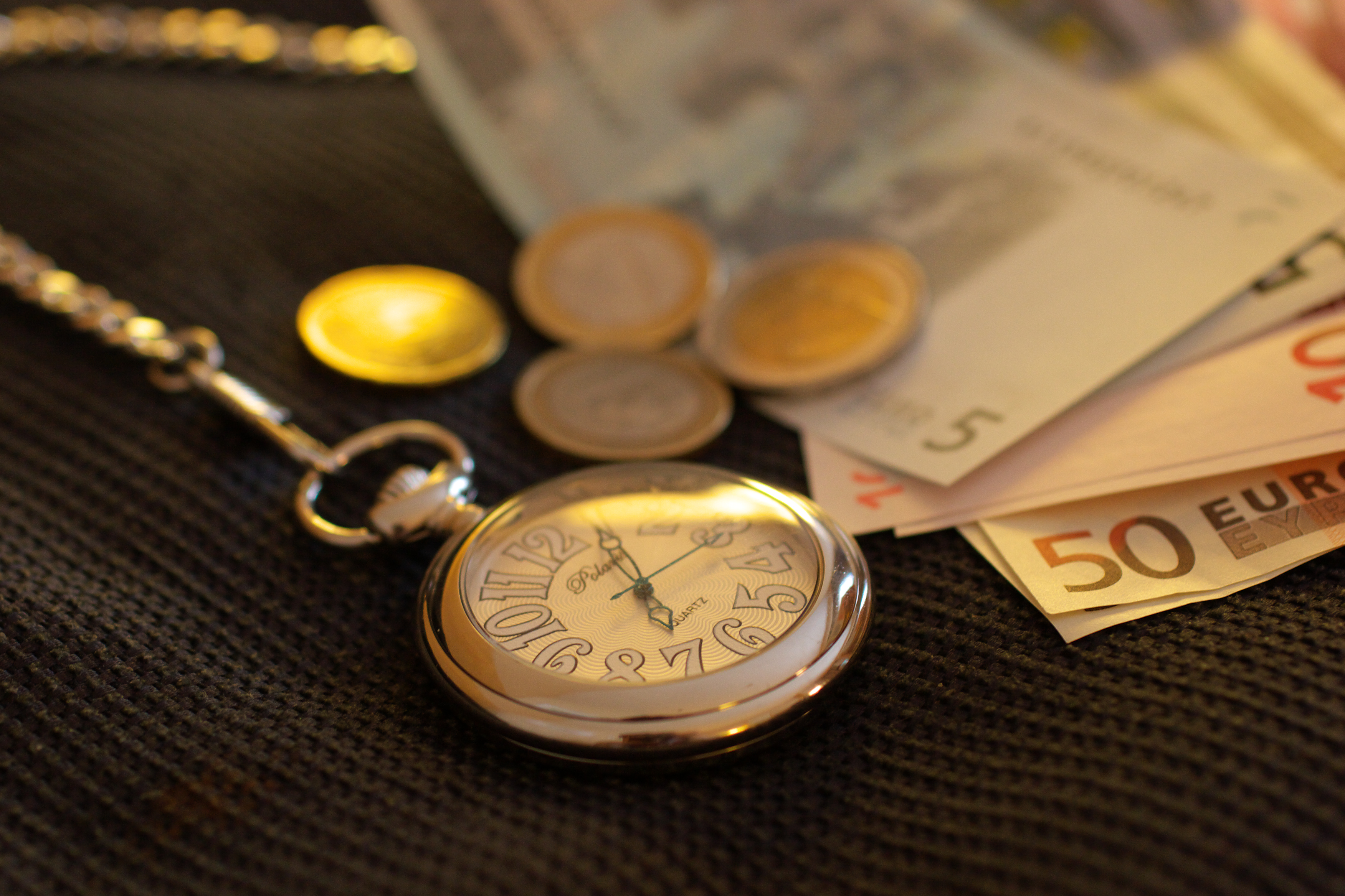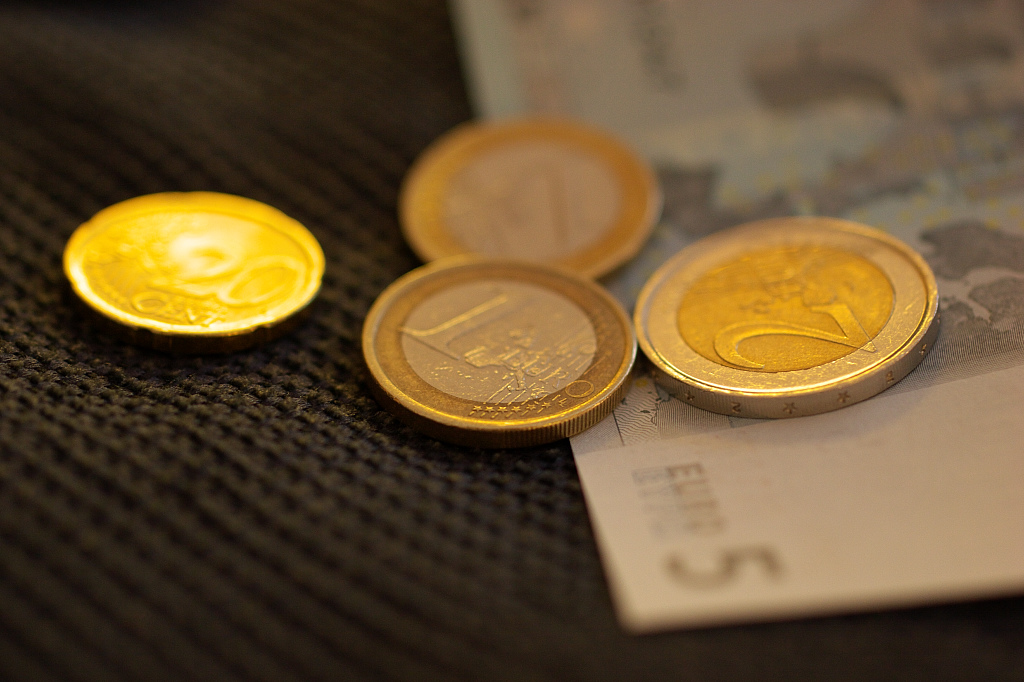 No.ソファの上に転がったユーロコインと紙幣。