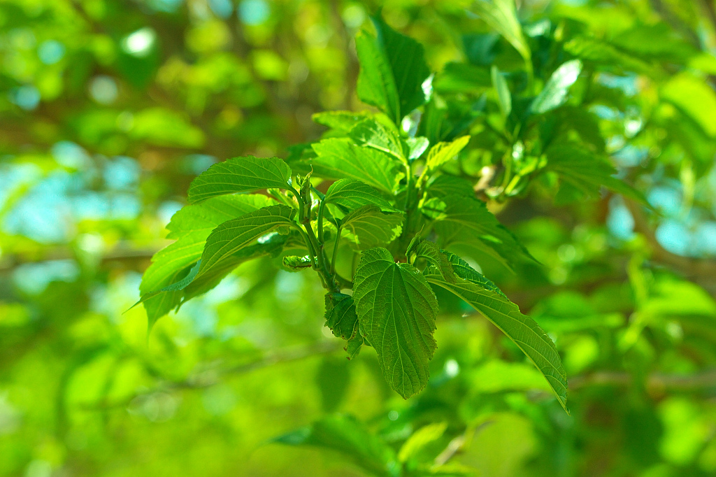 陽光にきらめく青緑色の葉。