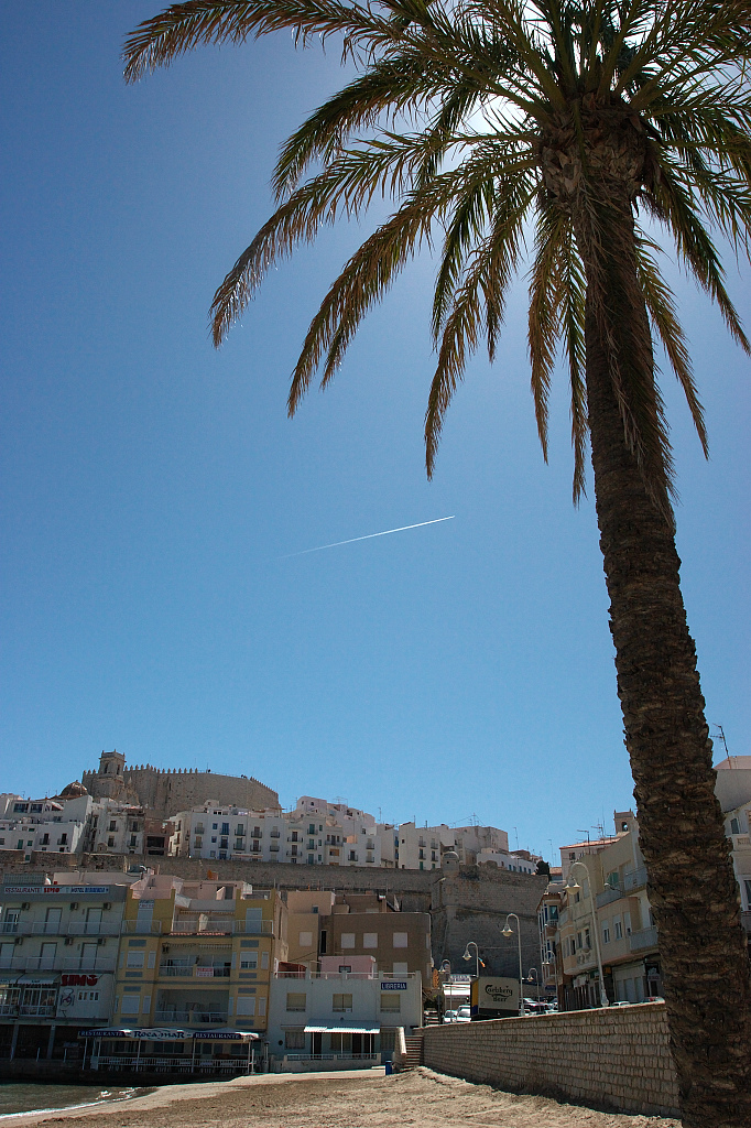 砂浜と砦のある町。そして飛行機雲と椰子の木。