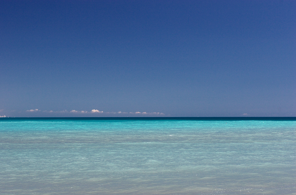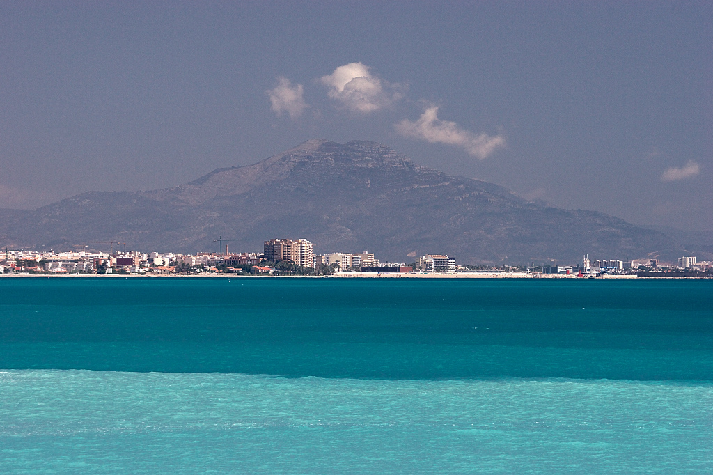 白く干上がった干潟の向こうに青い空を背景としたリゾート地が広がっています。